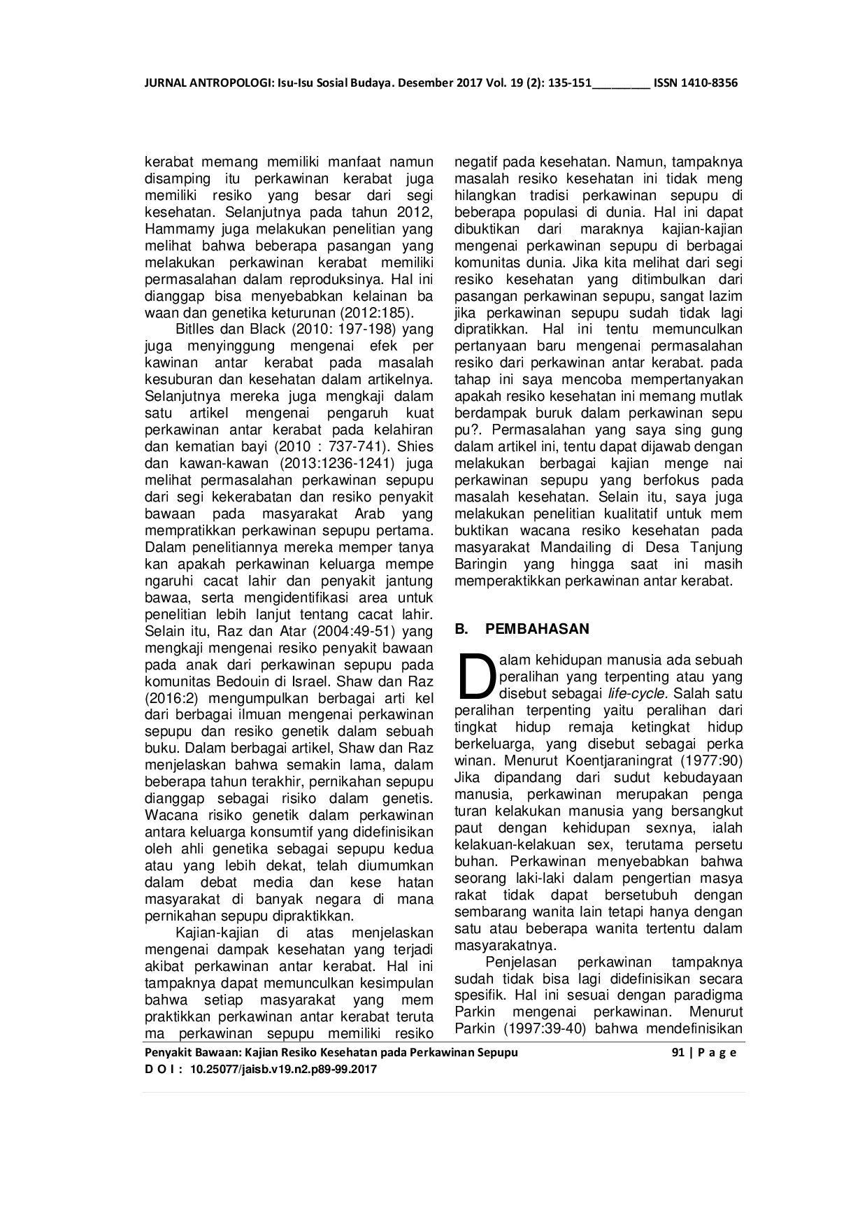 Jurnal Antropologi: Isu-Isu Sosial BudayaJurnal Antropologi: Isu-Isu Sosial BudayaTulisan ini bertujuan untuk mengkaji mengenai apakah penyakit bawaan menjadi resiko mutlak pada semua jenis perkawinan sepupu. Metode: kajian ini merupakan sebuah hasil review dari berbagai literatur mengenai perkawinan sepupu dan penyakit bawaan dalam perkawinan sepupu, serta penelitian kualitatif yang dilakukan pada masyarakat Mandailing di desa Tanjung Baringin Sumatera Utara yang banyak memperaktekkan perkawinan sepupu silang. Hasil menunjukkan bahwa resiko penyakit yang menjadi dampak perkawinan sepupu, bukanlah dampak negatif yang mutlak pada semua pasangan sepupu. Pasangan sepupu yang bersifat paralel memiliki kemungkinan yang besar untuk mengalaminya. Hal tersebut dapat dibuktikan dari beberapa peneliti yang mengkaji resiko kesehatan pada populasi yang mempraktikkan perkawinan sepupu paralel. Pada pasangan sepupu yang cross-cousin tidak menemukan adanya dampak resiko kesehatan. Oleh sebab itu, perkawinan sepupu hingga saat ini masih tetap bertahan terutama pada perkawinan sepupu silang.