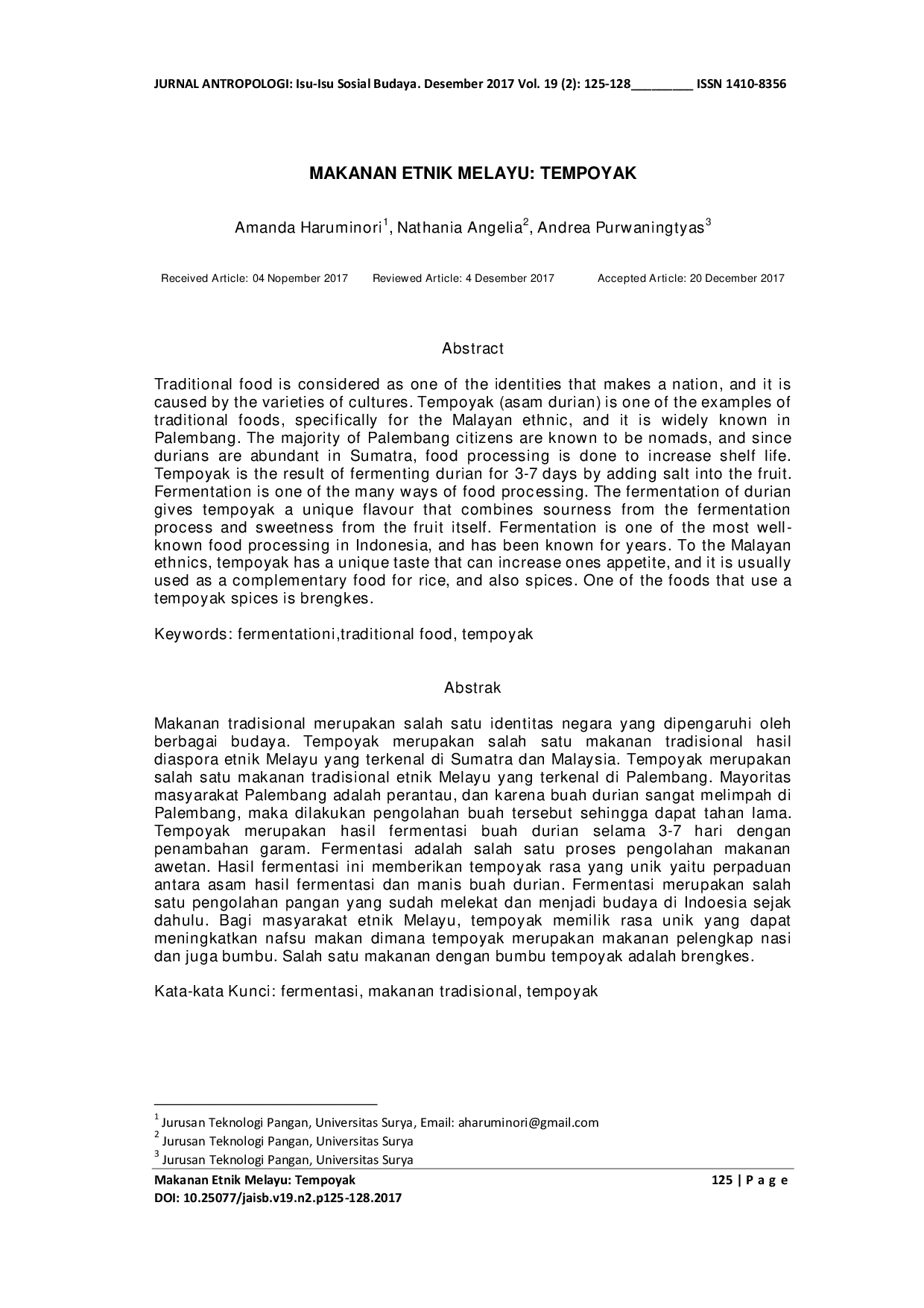 Jurnal Antropologi: Isu-Isu Sosial BudayaJurnal Antropologi: Isu-Isu Sosial BudayaMakanan tradisional merupakan salah satu identitas negara yang dipengaruhi oleh berbagai budaya. Tempoyak merupakan salah satu makanan tradisional hasil diaspora etnik Melayu yang terkenal di Sumatra dan Malaysia. Tempoyak merupakan salah satu makanan tradisional etnik Melayu yang terkenal di Palembang. Mayoritas masyarakat Palembang adalah perantau, dan karena buah durian sangat melimpah di Palembang, maka dilakukan pengolahan buah tersebut sehingga dapat tahan lama. Tempoyak merupakan hasil fermentasi buah durian selama 3-7 hari dengan penambahan garam. Fermentasi adalah salah satu proses pengolahan makanan awetan. Hasil fermentasi ini memberikan tempoyak rasa yang unik yaitu perpaduan antara asam hasil fermentasi dan manis buah durian. Fermentasi merupakan salah satu pengolahan pangan yang sudah melekat dan menjadi budaya di Indoesia sejak dahulu. Bagi masyarakat etnik Melayu, tempoyak memilik rasa unik yang dapat meningkatkan nafsu makan dimana tempoyak merupakan makanan pelengkap nasi dan juga bumbu. Salah satu makanan dengan bumbu tempoyak adalah brengkes.