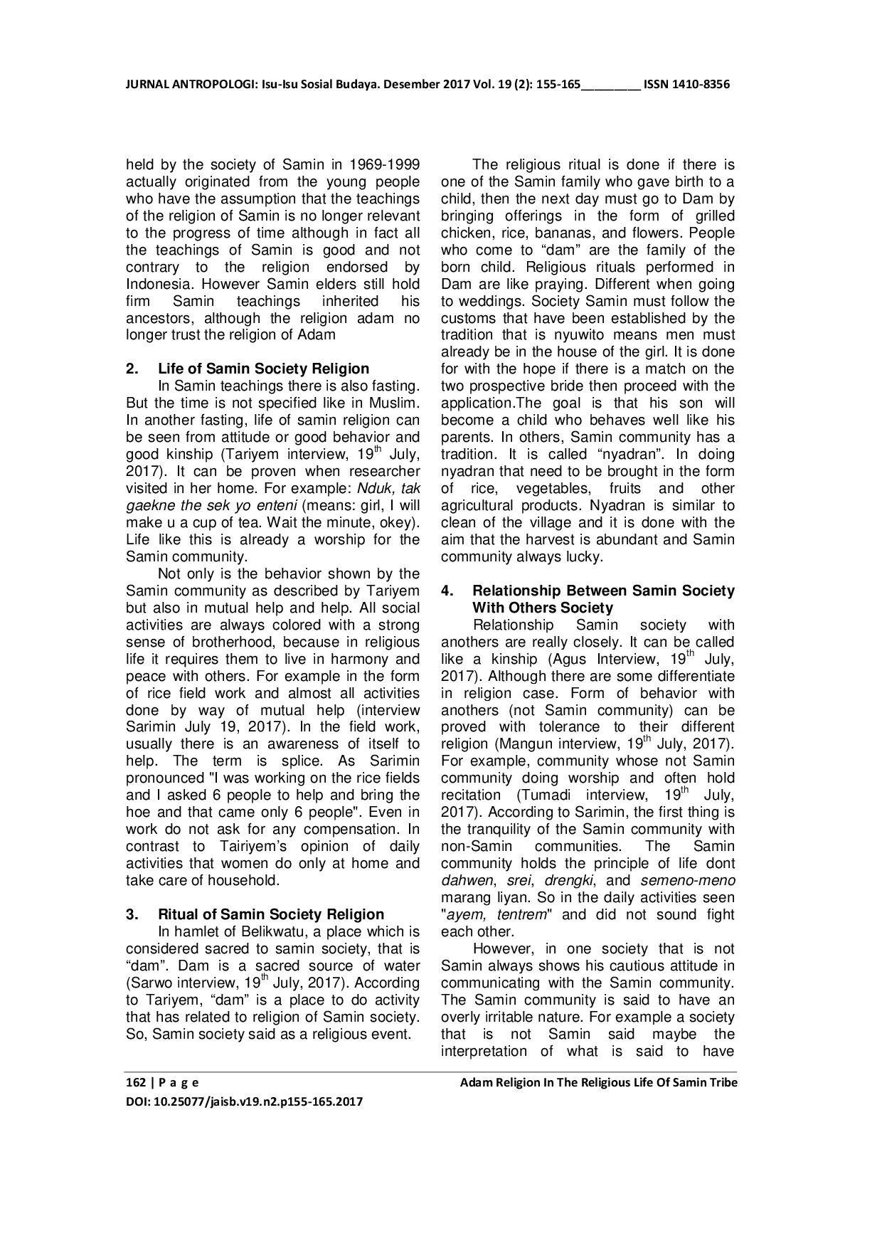 Jurnal Antropologi: Isu-Isu Sosial BudayaJurnal Antropologi: Isu-Isu Sosial BudayaPenelitian ini bertujuan untuk mengetahui perkembangan kehidupan keagamaan masyarakat Samin di Dusun Belikwatu Desa Sumberbening Kecamatan Bringin Kabupaten Ngawi pada tahun 1969-1999. Penelitian ini dilakukan selama lima bulan. Sumber data yang dapat digunakan dalam penelitian ini adalah sumber data primer dan sumber data sekunder. Teknik pengambilan data melalui wawancara, observasi dan dokumentasi. Analisis datanya menggunakan analisis kualitatif model interaktif. Hasil penelitian menunjukkan bahwa religi dalam masyarakat merupakan sumber sikap altruistik yang mempunyai dampak mengendalikan egoisme, yang mendorong manusia untuk berkorban dan tidak pamrih. Orang yang harus mengetahui bahwa para umat manusia, religinya merupakan sesuatu yang nyata dan benar. Kehidupan keagamaan masyarakat Samin mempunyai sikap dan perilaku yang baik terhadap masyarakat Samin maupun masyarakat yang bukan Samin. Masyarakat Samin menyatakan bahwa dirinya itu tidak memiliki agama, namun agama dari masyarakat Samin adalah agama Adam. Agama adam memang bukan sebuah agama namun sebagai kepercayaan. Inti ajaran dari agama Adam yaitu Manunggaling Kawolu Gusti. Masyarakat Samin menyebut Yang Maha Esa dengan Hyang Wenang Pramesti Agung. Selanjutnya dalam hal puasa agama Samin yang dijalaninya setiap hari yang menurut mereka lebih dari puasa-puasa pada umumnya yang terdapat dalam ajaran keagamaan bukan Samin dan dapat dipertanggung jawabkan dikemudian hari.