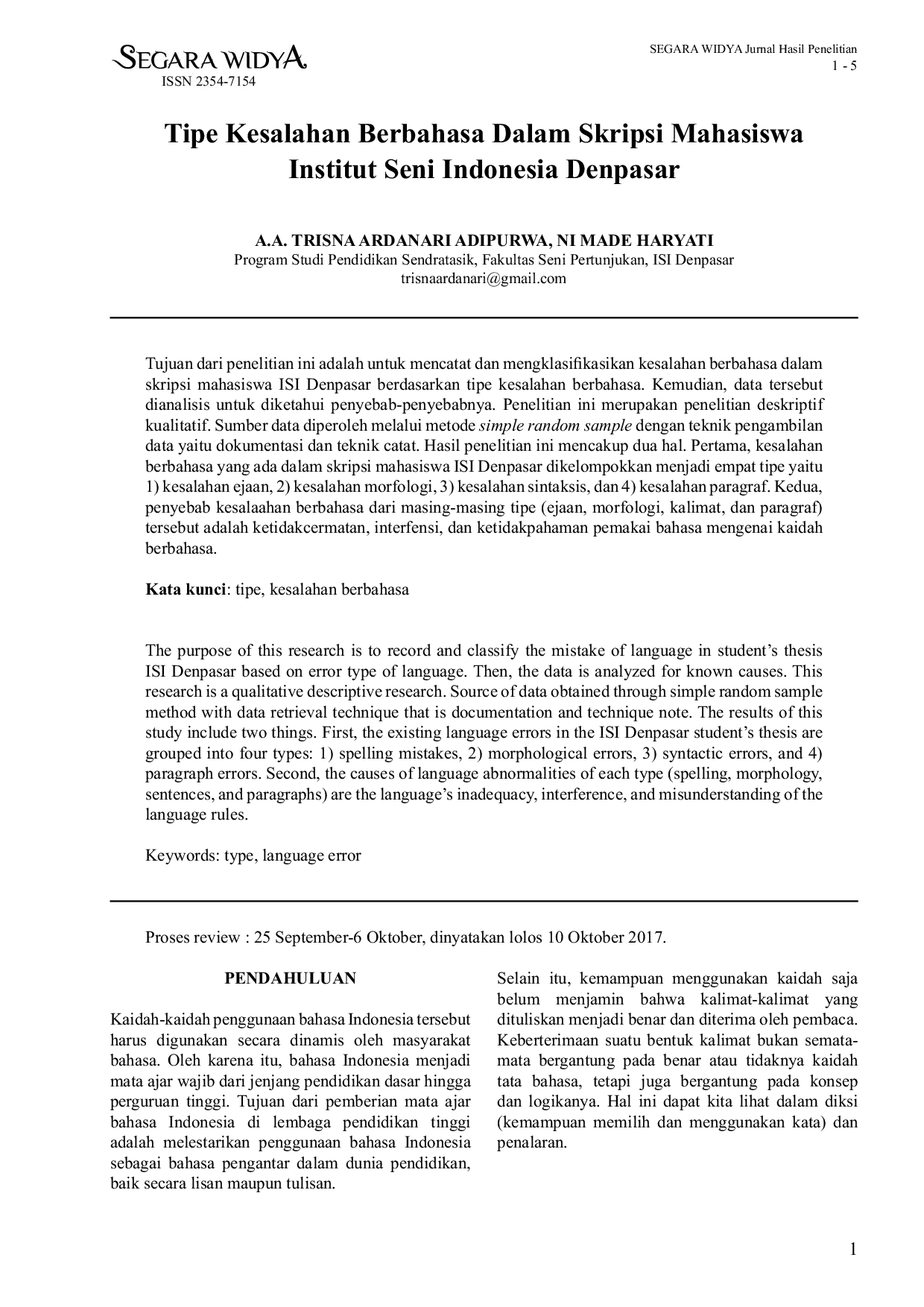 Kesalahan berbahasa yang ada dalam skripsi mahasiswa ISI Denpasar dikelompokkan menjadi empat tipe yaitu 1) kesalahan ejaan, 2) kesalahan tataran morfologi, 3) kesalahan tataran sintaksis, dan 4) kesalahan tataran paragraf.Penyebab kesalahan berbahasa dari masing-masing tipe (ejaan, morfologi, kalimat, dan paragraf) tersebut adalah ketidakcermatan, interfensi, dan ketidakpahaman pemakai bahasa mengenai kaidah berbahasa.Oleh karena itu, pengajaran penggunaan kaidah berbahasa perlu ditingkatkan untuk mengurangi kesalahan berbahasa dalam penulisan skripsi mahasiswa.