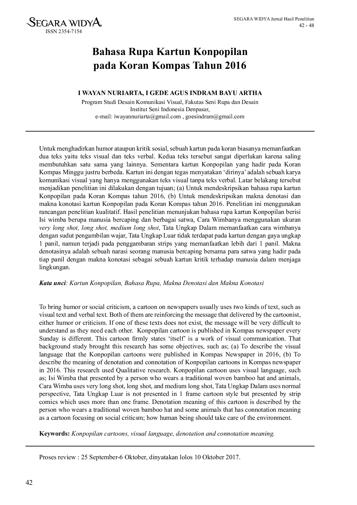 Segara Widya : Jurnal Penelitian SeniSegara Widya : Jurnal Penelitian SeniPenelitian ini bertujuan untuk mendeskripsikan , serta makna denotasi dan konotasinya. Kartun Konpopilan unik karena hanya menggunakan teks visual tanpa teks verbal. Penelitian ini menggunakan rancangan penelitian kualitatif. Hasil penelitian menunjukkan bahasa rupa kartun Konpopilan berisi manusia bercaping dan berbagai satwa, dengan cara wimba menggunakan ukuran very long shot, long shot, medium long shot, dan sudut pengambilan wajar. Makna denotasinya adalah narasi manusia bercaping bersama satwa, sementara makna konotasinya adalah kritik terhadap manusia dalam menjaga lingkungan.
