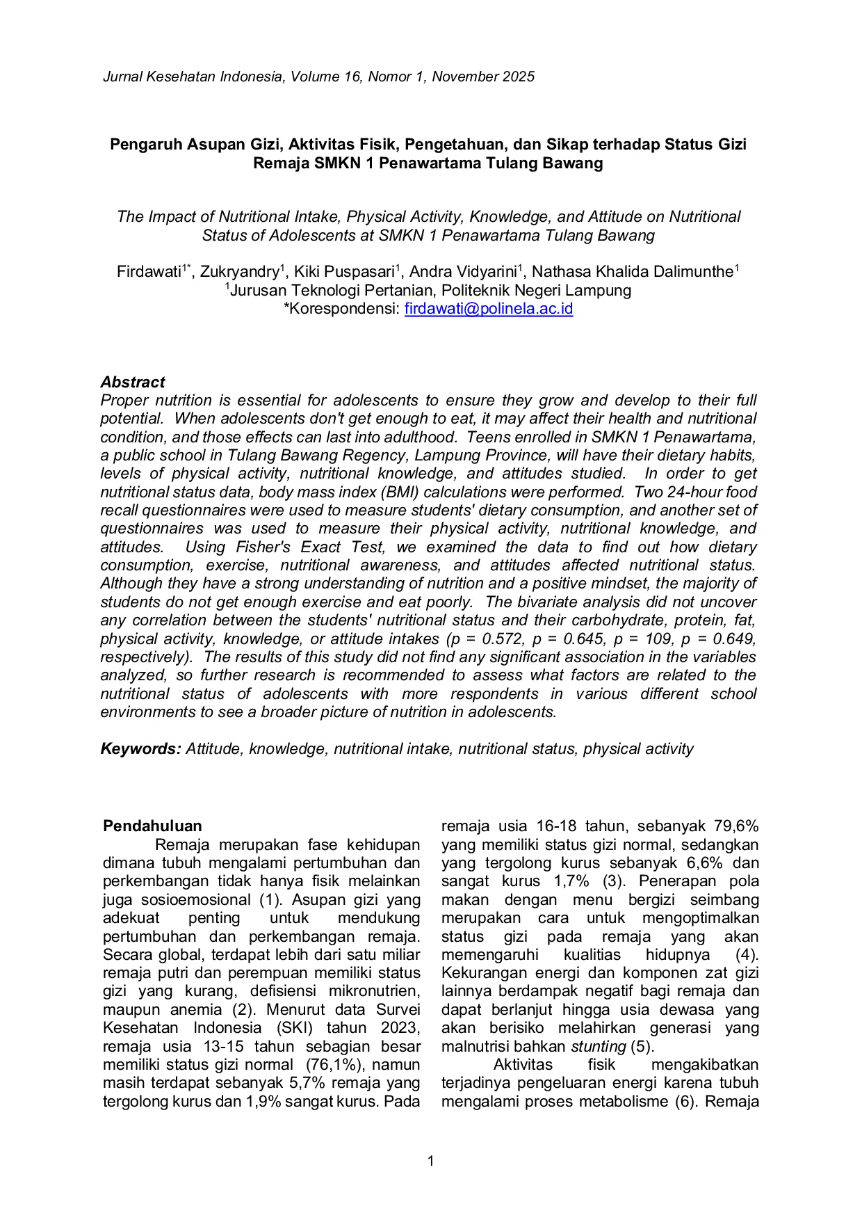 JURKESSIAJURKESSIAAsupan gizi yang memadai sangat penting bagi pertumbuhan dan perkembangan remaja. Namun, sebagian besar siswa SMKN 1 Penawartama memiliki asupan karbohidrat, protein, dan lemak yang kurang serta aktivitas fisik rendah. Meskipun pengetahuan dan sikap terhadap gizi baik, tidak ditemukan hubungan signifikan antara variabel tersebut dengan status gizi. Penelitian ini merekomendasikan penelitian lanjutan dengan sampel lebih besar dan lingkungan sekolah yang beragam untuk memahami faktor-faktor yang memengaruhi status gizi remaja.