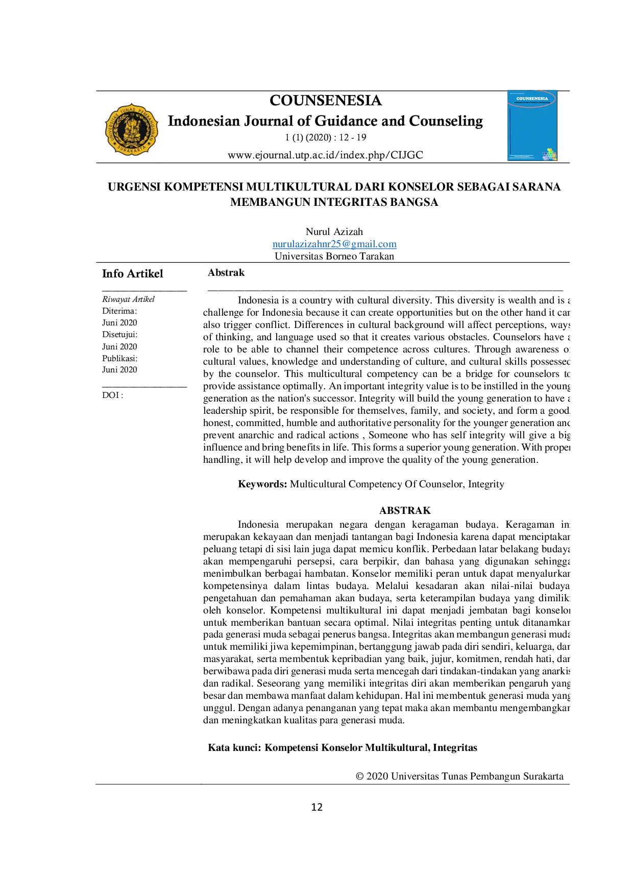 Counsenesia Indonesian Journal Of Guidance and CounselingCounsenesia Indonesian Journal Of Guidance and CounselingIndonesia merupakan negara dengan keragaman budaya. Keragaman ini merupakan kekayaan dan menjadi tantangan bagi Indonesia karena dapat menciptakan peluang tetapi di sisi lain juga dapat memicu konflik. Perbedaan latar belakang budaya akan mempengaruhi persepsi, cara berpikir, dan bahasa yang digunakan sehingga menimbulkan berbagai hambatan. Konselor memiliki peran untuk dapat menyalurkan kompetensinya dalam lintas budaya. Melalui kesadaran akan nilai-nilai budaya, pengetahuan dan pemahaman akan budaya, serta keterampilan budaya yang dimiliki oleh konselor. Kompetensi multikultural ini dapat menjadi jembatan bagi konselor untuk memberikan bantuan secara optimal. Nilai integritas penting untuk ditanamkan pada generasi muda sebagai penerus bangsa. Integritas akan membangun generasi muda untuk memiliki jiwa kepemimpinan, bertanggung jawab pada diri sendiri, keluarga, dan masyarakat, serta membentuk kepribadian yang baik, jujur, komitmen, rendah hati, dan berwibawa pada diri generasi muda serta mencegah dari tindakan-tindakan yang anarkis dan radikal. Seseorang yang memiliki integritas diri akan memberikan pengaruh yang besar dan membawa manfaat dalam kehidupan. Hal ini membentuk generasi muda yang unggul. Dengan adanya penanganan yang tepat maka akan membantu mengembangkan dan meningkatkan kualitas para generasi muda.