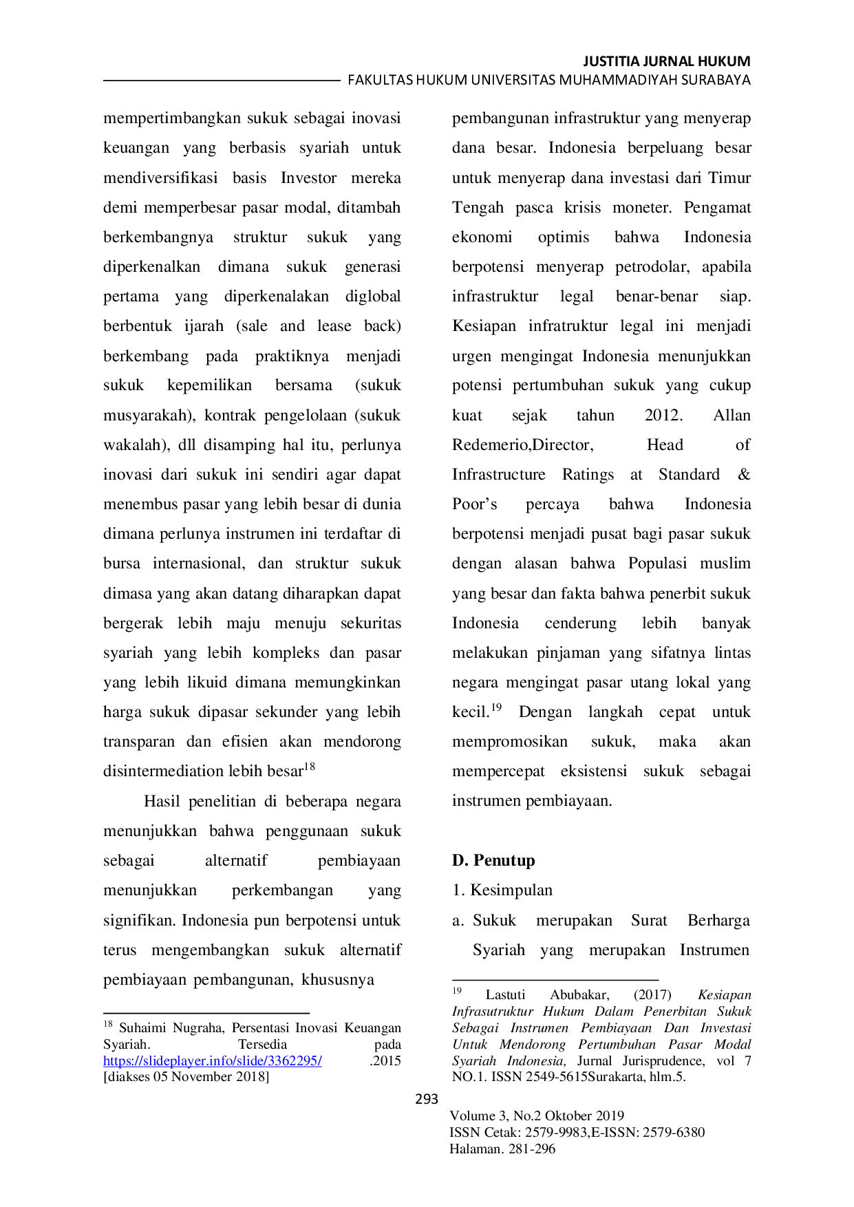 Justitia Jurnal HukumJustitia Jurnal HukumSukuk merupakan bagian dari instrumen keuangan syariah yang mempunyai potensi besar dalam menyerap dan mengembangkan dana masyarakat pasca krisis. Peran sukuk dalam pertumbuhan keuangan syariah cukup diperhitungkan, mengingat populasi muslim yang besar dan keuntungan yang didapat dalam metode syariah ini. Sukuk adalah salah satu alternatif bagi investasi maupun pembiayaan, baik itu korporasi maupun pemerintah dalam membangun infrastruktur di Indonesia. Dalam hal keuangan syariah, sukuk adalah suatu hal yang tergolong baru di telinga masyarakat, berbeda dengan perbankan syariah yang lebih dulu dikenal. Dalam rangka membangun manfaat dari sistem kesyariah-an, instrumen keuangan syariah menjadikan sukuk sebagai inovasi dalam investasi dan pembiayaan, dimana sebelum adanya sukuk negara maupun korporasi, pendanaan biasanya dilakukan dengan cara Obligasi maupun Surat Utang Negara (SUN). Sukuk muncul memberikan alternatif akan sistem konvensional. Dalam perkembangannya sukuk mengalami peningkatan dari masa ke masa, dimana ketika sukuk pertama kali diterbitkan menimbulkan antusiasme para investor ditandai dengan diserap habisnya sukuk korporasi oleh Indosat. Pemerintah mengeluarkan UU tentang Surat Berharga Syariah Nasional (SBSN) yang dimaksudkan untuk memuluskan jalan dari perkembangan sukuk itu sendiri hingga pada saat ini pemerintah menjadikan sukuk sebagai alternatif pembiayaan paling diminati dalam menyerap dana untuk pembangunan tanah air.