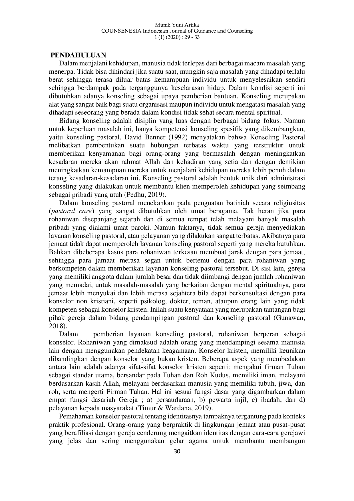 Counsenesia Indonesian Journal Of Guidance and CounselingCounsenesia Indonesian Journal Of Guidance and CounselingDalam konseling pastoral menekankan pada penguatan batiniah secara religiusitas (pastoral care) yang sangat dibutuhkan oleh umat beragama. Konseling pastoral merupakan bentuk unik dari administrasi konseling yang dilakukan untuk membantu klien memperoleh kehidupan yang seimbang sebagai pribadi yang utuh. Keberadaan rohaniwan menjadi suatu hal yang krusial bagi para jemaat Kristen. Sebab rohaniwan mengambil peran seseorang yang dianggap dapat membantu dan memberikan harapan pada jemaat. Selain itu rohiawan juga berperan sebagai konselor pastoral yang memiliki keunikan diantara konselor pada umumnya, baik dalam fungsi sosial maupun simbolis. Konselor pastoral yang bertugas di lembaga-lembaga publik dan melihat diri mereka sebagai teolog publik yang menanamkan nilai-nilai pastoral ke dalam layanan sosial dan pasar medis. Artikel ini merupakan sebuah gagasan konseptual yang pengumpulan datanya diperoleh dari artikel-artikel dari jurnal yang relevan dengan gagasan ini, dan diperkuat oleh wawancara dengan salah satu rohaniwan (romo), serta dokumentasi.