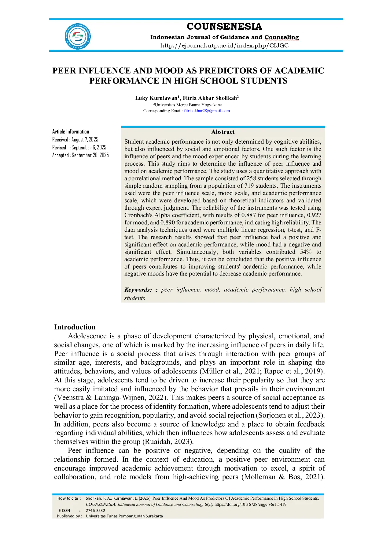Counsenesia Indonesian Journal Of Guidance and CounselingCounsenesia Indonesian Journal Of Guidance and CounselingPenelitian ini bertujuan untuk menentukan pengaruh pengaruh teman sebaya dan suasana hati terhadap prestasi akademik. Penelitian menggunakan pendekatan kuantitatif dengan metode korelasional. Sampel penelitian terdiri dari 258 siswa yang dipilih melalui sampling acak sederhana dari populasi 719 siswa. Instrumen yang digunakan adalah skala pengaruh teman sebaya, skala suasana hati, dan skala prestasi akademik, yang dikembangkan berdasarkan indikator teoritis dan divalidasi melalui penilaian ahli. Keandalan instrumen diuji menggunakan koefisien Alpha Cronbach, dengan hasil 0,887 untuk pengaruh teman sebaya, 0,927 untuk suasana hati, dan 0,890 untuk prestasi akademik, menunjukkan keandalan tinggi. Teknik analisis data yang digunakan adalah regresi linier berganda, uji t, dan uji F. Hasil penelitian menunjukkan bahwa pengaruh teman sebaya memiliki efek positif dan signifikan terhadap prestasi akademik, sedangkan suasana hati memiliki efek negatif dan signifikan. Secara bersamaan, kedua variabel ini berkontribusi sebesar 54% terhadap prestasi akademik. Sehingga, dapat disimpulkan bahwa pengaruh positif teman sebaya berkontribusi pada peningkatan prestasi akademik siswa, sedangkan suasana hati negatif berpotensi menurunkan prestasi akademik.