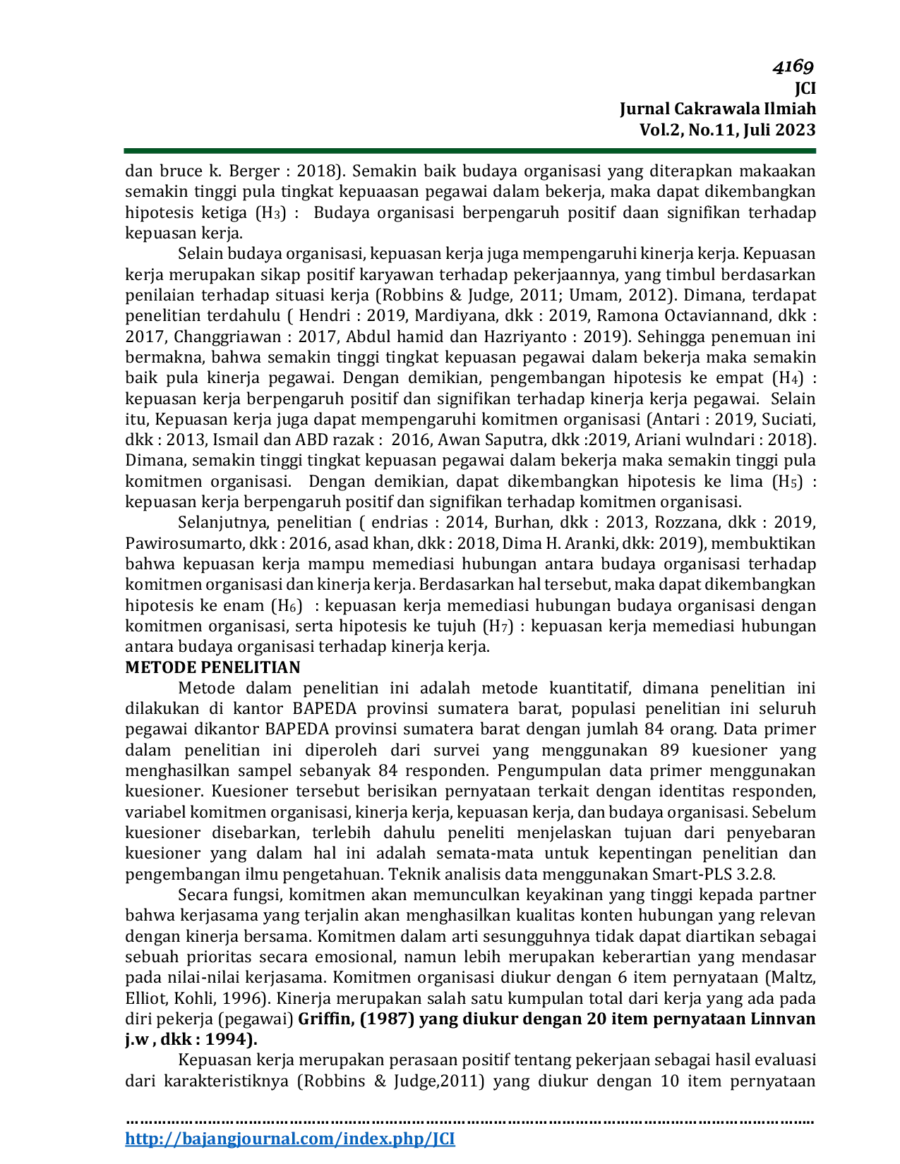 Jurnal Cakrawala IlmiahJurnal Cakrawala IlmiahPenelitian ini bertujuan untuk menguji peran kepuasan kerja sebagai mediasi antara budaya organisasi terhadap komitmen organisasi dan kinerja kerja. Data primer diperoleh dari survei menggunakan 89 kuesioner di BAPEDA Provinsi Sumatera Barat yang menghasilkan sampel 84 responden. Analisis menunjukkan bahwa budaya organisasi memiliki pengaruh positif dan signifikan terhadap kepuasan kerja, komitmen organisasi, dan kinerja kerja. Penelitian ini juga menemukan bahwa kepuasan kerja memediasi hubungan antara budaya organisasi, komitmen organisasi, dan kinerja kerja.