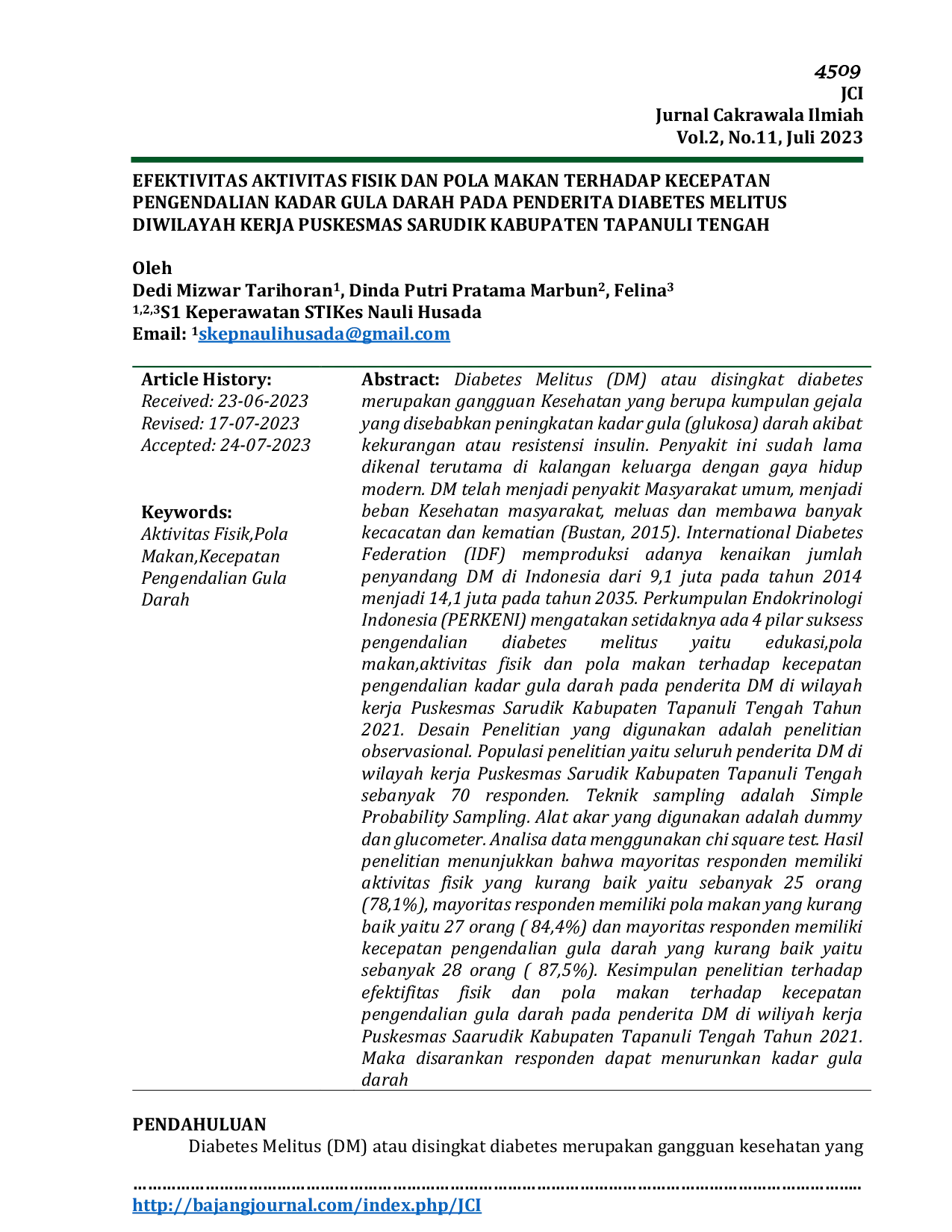 Jurnal Cakrawala IlmiahJurnal Cakrawala IlmiahDiabetes Melitus (DM) atau disingkat diabetes merupakan gangguan kesehatan yang berupa kumpulan gejala yang disebabkan peningkatan kadar gula (glukosa) darah akibat kekurangan atau resistensi insulin. Penyakit ini sudah lama dikenal terutama di kalangan keluarga dengan gaya hidup modern. DM telah menjadi penyakit masyarakat umum, menjadi beban kesehatan masyarakat, meluas dan membawa banyak kecacatan dan kematian. International Diabetes Federation (IDF) memproduksi adanya kenaikan jumlah penyandang DM di Indonesia dari 9,1 juta pada tahun 2014 menjadi 14,1 juta pada tahun 2035. Penelitian ini bertujuan untuk menganalisa efektifitas aktifitas fisik dan pola makan terhadap kecepatan pengendalian kadar gula darah. Penelitian ini juga merupakan penelitian eksperimen dimana peneliti melakukan intervensi terhadap variabel aktifitas fisik (jogging, jalan pagi, senam). Penelitian ini dilaksanakan di wilayah kerja Puskesmas Sarudik Kabupaten Tapanuli Tengah Tahun 2021 dengan alasan tingginya angka kasus DM di Puskesmas tersebut. Penelitian ini akan dilaksanakan pada bulan Juli-September tahun 2021. Hasil penelitian menunjukkan bahwa mayoritas responden memiliki aktivitas fisik yang kurang baik yaitu sebanyak 25 orang (78,1%) dan minoritas memiliki aktivitas fisik yang baik sebanyak 7 orang (21,9%). Mayoritas responden memiliki kecepatan pengendalian gula darah yang kurang baik yaitu sebanyak 28 orang (87,5%) dan minoritas memiliki kecepatan pengendalian gula darah yang baik sebanyak 4 orang (12,5%). Hasil uji chi square diperoleh X² hitung sebesar 16,327 lebih besar dari X² tabel. Hal ini berarti bahwa hipotesa alternatif (Ha) pada penelitian ini diterima. Artinya terdapat efektifitas aktivitas fisik terhadap kecepatan pengendalian gula darah pada penderita DM di wilayah kerja Puskesmas Sarudik Kabupaten Tapanuli Tengah Tahun 2021. Hasil uji chi square diperoleh X² hitung sebesar 12,224 lebih besar dari X² tabel. Hal ini berarti bahwa hipotesa alternatif (Ha) pada penelitian ini diterima. Artinya terdapat efektifitas pola makan terhadap kecepatan pengendalian gula darah pada penderita DM di wilayah kerja Puskesmas Sarudik Kabupaten Tapanuli Tengah Tahun 2021.