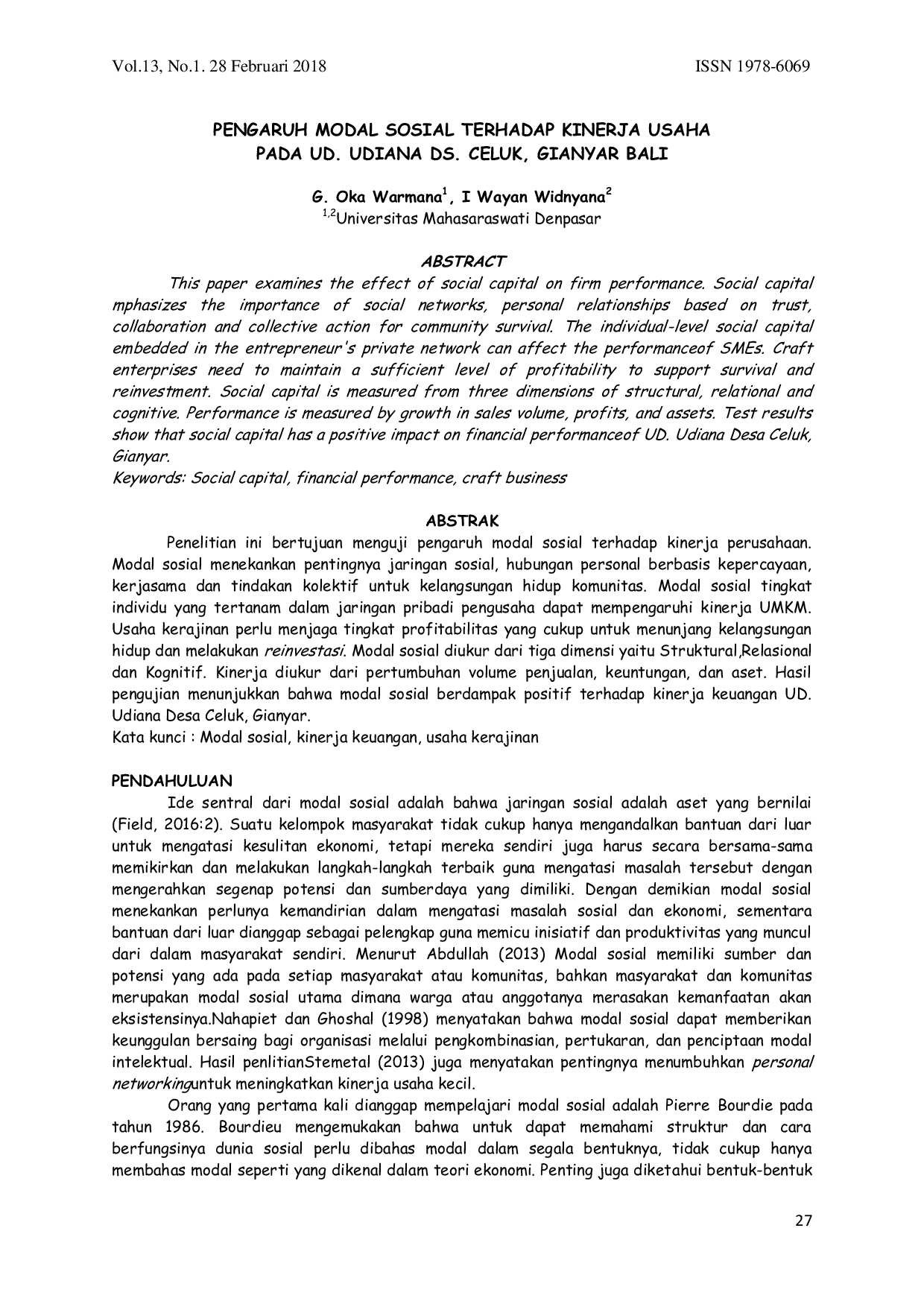 Jurnal Ekonomi dan PariwisataJurnal Ekonomi dan PariwisataPenelitian ini bertujuan menguji pengaruh modal sosial terhadap kinerja perusahaan. Modal sosial menekankan pentingnya jaringan sosial, hubungan personal berbasis kepercayaan, kerjasama dan tindakan kolektif untuk kelangsungan hidup komunitas. Modal sosial tingkat individu yang tertanam dalam jaringan pribadi pengusaha dapat mempengaruhi kinerja UMKM. Usaha kerajinan perlu menjaga tingkat profitabilitas yang cukup untuk menunjang kelangsungan hidup dan melakukan reinvestasi. Modal sosial diukur dari tiga dimensi yaitu Struktural, Relasional dan Kognitif. Kinerja diukur dari pertumbuhan volume penjualan, keuntungan, dan aset. Hasil pengujian menunjukkan bahwa modal sosial berdampak positif terhadap kinerja keuangan UD. Udiana Desa Celuk, Gianyar.