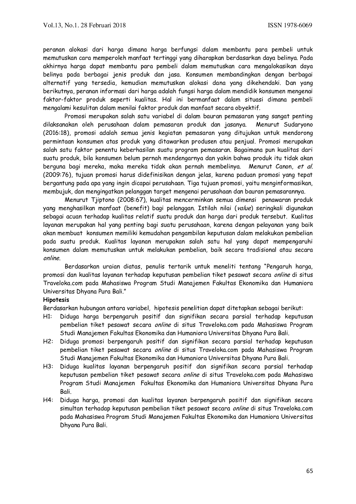 Jurnal Ekonomi dan PariwisataJurnal Ekonomi dan PariwisataPenelitian ini bertujuan untuk mengetahui seberapa besar pengaruh harga, promosi dan kualitas layanan terhadap keputusan pembelian tiket pesawat secara online di situs Traveloka.com. Populasi dalam penelitian ini adalah Mahasiswa aktif Program Studi Manajemen, Fakultas Ekonomika dan Humaniora, Universitas Dhyana Pura Bali tahun akademik 2016/2017. Sampel yang diambil sebanyak 89 mahasiswa menggunakan teknik Non-Probability Sampling dengan pendekatan purposive sampling. Proses analisis data menggunakan bantuan perangkat lunak SPSS 21.0 for windows. Data yang diperoleh dianalisis menggunakan analisis korelasi parsial, analisis korelasi berganda, analisis determinasi, analisis regresi linear berganda, uji T dan uji F. Hasil dari penelitian menunjukkan ada pengaruh secara parsial dan silmultan antara harga, promosi, dan kualitas layanan terhadap keputusan pembelian dengan persamaan regresi Y = 3,316 0,916X1 0,304X2 0,259X3 yang artinya koefisien regresi harga bernilai positif sebesar 0,916, koefisien regresi promosi bernilai positif sebesar 0,304, koefisien regresi kualitas layanan bernilai positif sebesar 0,259 dan koefisien keputusan pembelian sebesar 3,316. Nilai R Square adalah 0,754 yang artinya kontribusi variabel harga, promosi dan kualitas layanan terhadap keputusan pembelian sebesar 75,4% sedang sisanya sebesar 24,6% dipengaruhi oleh variabel lain yang tidak diteliti dalam penelitian ini. Berdasarkan uji T harga, promosi dan kualitas layanan berpengaruh positif dan signifikan secara parsial terhadap keputusan pembelian tiket pesawat secara online di situs Traveloka.com. Berdasarkan uji F harga, promosi dan kualitas layanan berpengaruh secara positif dan signifikan secara simultan terhadap keputusan pembelian tiket pesawat secara online di situs Traveloka.com.
