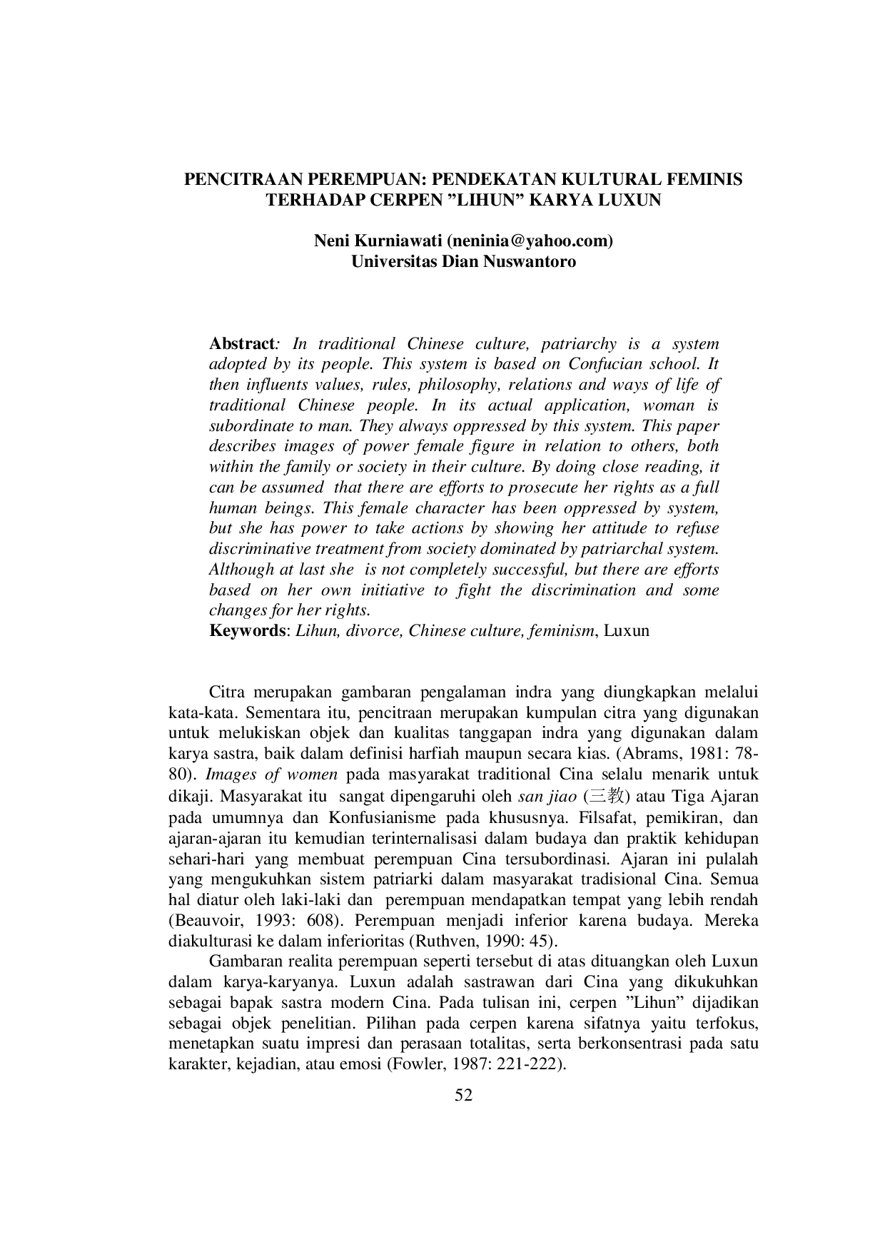Penelitian ini menyimpulkan bahwa pencitraan perempuan dalam cerpen “Lihun ditunjukkan melalui sikap dan tindakan sadar tokoh perempuan, Aigu.Aigu menunjukkan dirinya sebagai perempuan yang berdaya dengan menyadari haknya sebagai manusia dan memperjuangkannya.Meskipun pada akhirnya ia harus mengakui kekuasaan hegemoni laki-laki atas perempuan, upayanya menunjukkan kesadaran diri untuk memberontak dan mendapatkan hak yang seharusnya.Upaya gigihnya membuahkan hasil berupa kompensasi perceraian, suatu hal yang belum pernah terjadi sebelumnya.