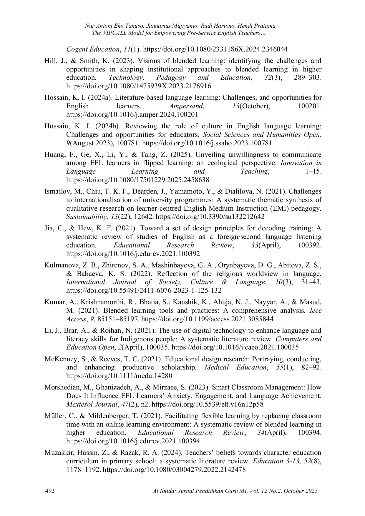 Al Ibtida: Jurnal Pendidikan Guru MIAl Ibtida: Jurnal Pendidikan Guru MISekolah dasar Islam menghadapi tantangan ganda, yaitu melestarikan nilai-nilai pedagogis keagamaan sekaligus beradaptasi dengan pembelajaran yang didukung teknologi. Studi ini memperkenalkan model pembelajaran campuran berbasis budaya, VIPCALL—Visualization, Interactive, and Personalized Instruction through Collaborative and Assisted Language Learning—untuk pengajaran Bahasa Inggris di Madrasah Ibtidaiyah. Model ini diimplementasikan selama 17 sesi Praktik Kerja Lapangan (PPL) dari Oktober hingga November 2024 dan melibatkan empat belas calon guru Bahasa Inggris dari tujuh sekolah dasar Islam di Jawa Barat. Mengikuti kerangka penelitian berbasis desain, pengumpulan data dilakukan melalui observasi, jurnal reflektif, sesi wawancara semi-terstruktur, kuesioner siswa, dan analisis artefak. Hasil penelitian menunjukkan bahwa VIPCALL secara signifikan meningkatkan kreativitas, literasi digital, dan integrasi nilai-nilai Islam dengan pembelajaran Bahasa Inggris interaktif pada calon guru. Siswa menunjukkan peningkatan keterlibatan di kelas, peningkatan penguasaan kosakata, dan kepercayaan diri yang lebih tinggi untuk berkomunikasi dalam Bahasa Inggris. Quizizz, kartu flash augmented reality, aktivitas berbasis cerita Islami, dan permainan untuk mempelajari kosakata menghasilkan hasil pembelajaran yang positif dan terbukti dapat diadaptasi ke konteks dengan sumber daya terbatas. Secara keseluruhan, VIPCALL menawarkan model pedagogis yang terukur, responsif secara budaya, dan berlandaskan bukti yang menghubungkan tradisi dan inovasi, mendukung Tujuan Pembangunan Berkelanjutan 4 (Pendidikan Berkualitas), serta menawarkan panduan praktis untuk pelatihan guru dan penggunaan teknologi di pendidikan dasar Islam.