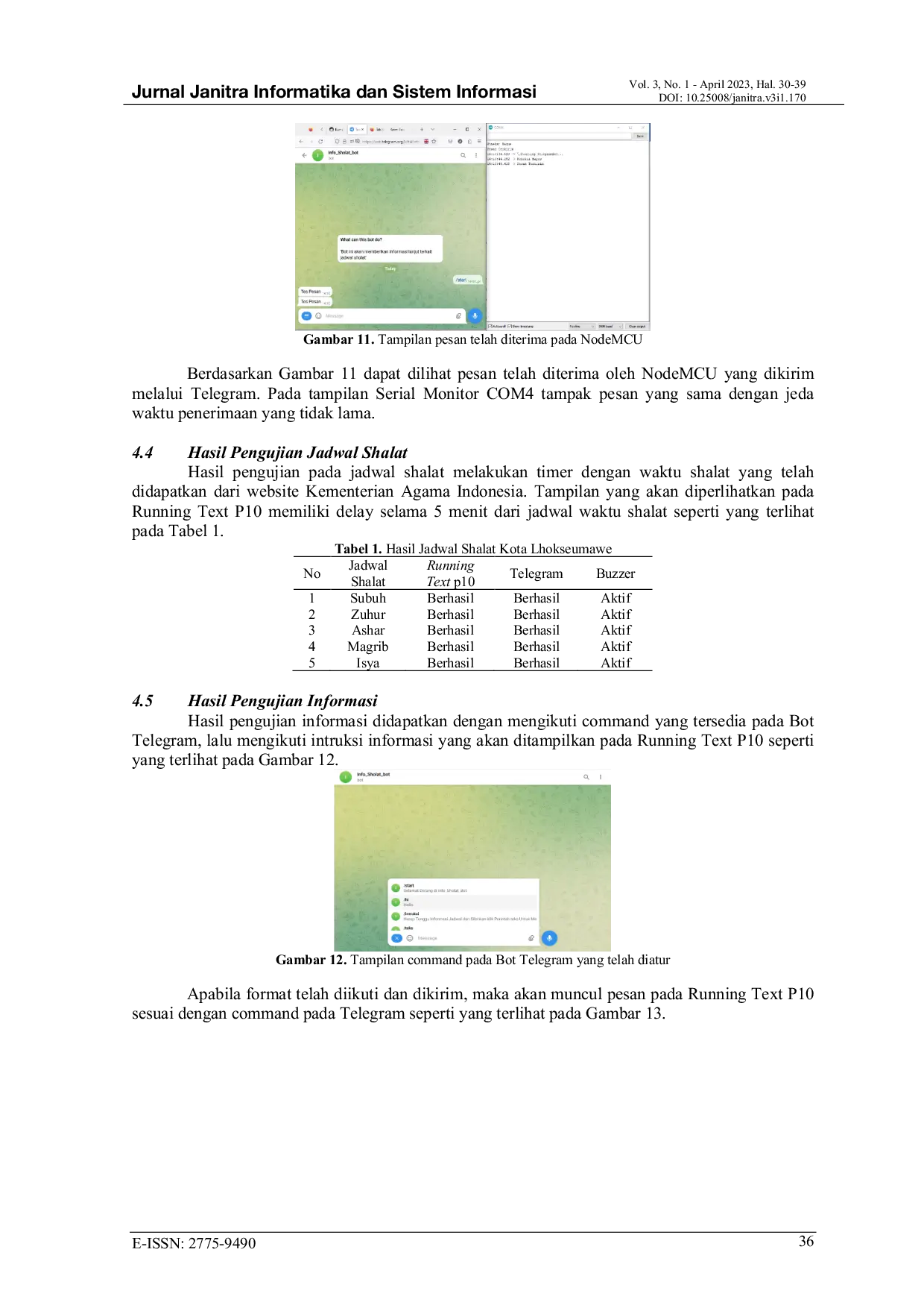 Jurnal Janitra Informatika dan Sistem InformasiJurnal Janitra Informatika dan Sistem InformasiRunning text merupakan media teknologi informasi yang menampilkan tulisan berjalan dengan berbagai variasi dan banyak terdapat di tempat‑tempat umum. Di antara penggunaannya adalah di tempat‑tempat shalat baik masjid ataupun mushalla (meunasah) untuk menampilkan informasi jadwal shalat lima waktu dan informasi aktivitas lainnya. Papan informasi yang banyak digunakan di masjid atau mushalla saat ini memiliki kekurangan dalam hal fleksibilitas pembaruan informasi yang menuntut petugas harus berada di dekat papan informasi saat mengunggah informasi ke perangkat tersebut. Penelitian ini bertujuan mendesain dan merealisasikan papan informasi jadwal shalat berbasis yang lebih fleksibel berbasis aplikasi Telegram yang memungkinkan petugas memperbaharui informasi dari jarak jauh. Papan informasi ini didesain menggunakan komponen‑komponen berupa NodeMCU, Running Text P10, aplikasi Telegram, dan akses WiFi untuk internet. Desain papan informasi meliputi aspek mekanis, aspek elektronis, dan aspek program sistem operasi. Desain sistem kemudian direalisasikan dan dilakukan pengujian. Hasil pengujian menunjukkan bahwa papan informasi jadwal shalat berbasis aplikasi Telegram berhasil bekerja dengan baik dan dapat memberikan informasi secara real time kepada masyarakat dan pengurus meunasah serta dapat diperbaharui informasinya oleh petugas.