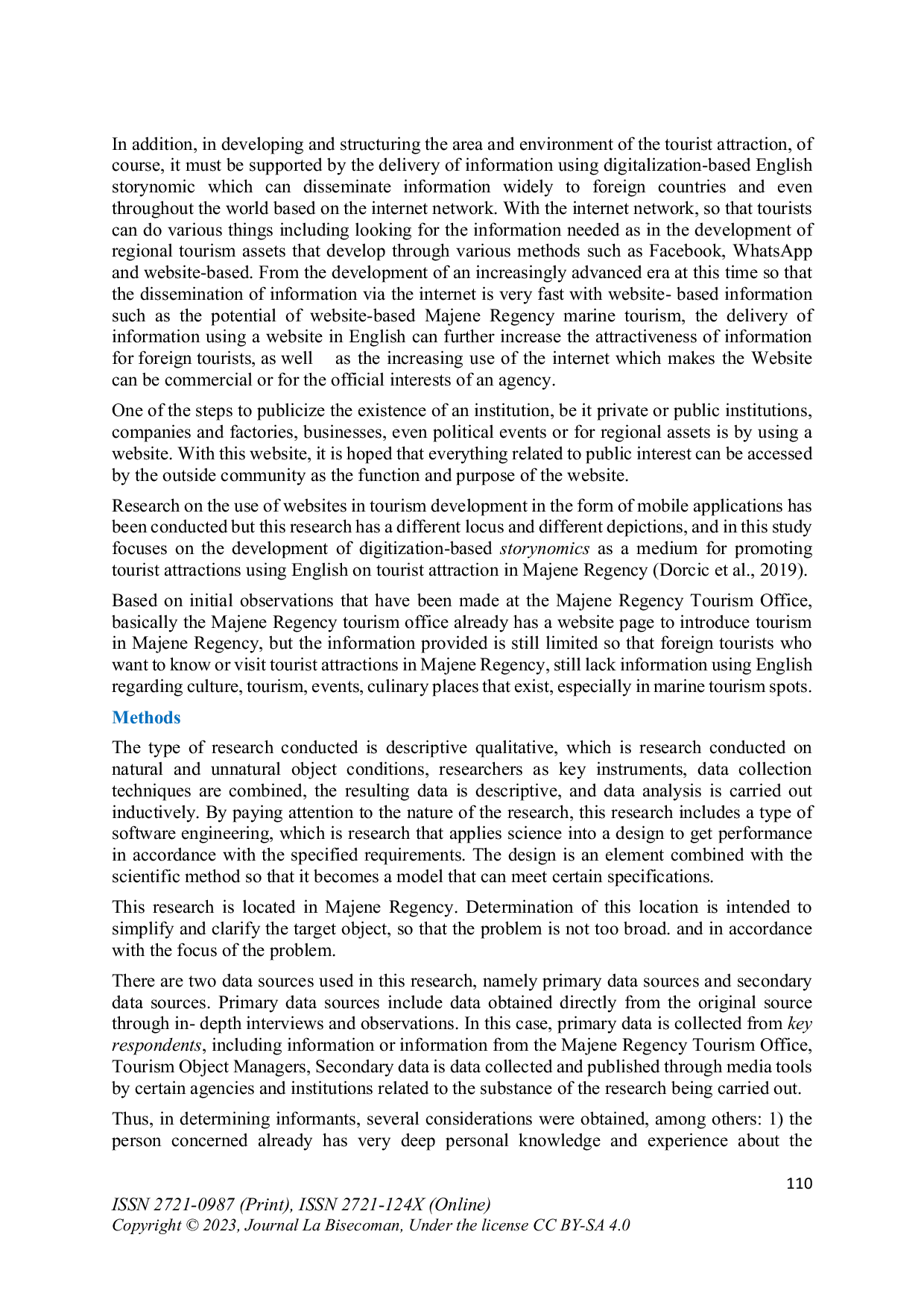 Journal La BisecomanJournal La BisecomanThis research uses a qualitative research approach, which aims to find out the development of storynomics using English-based digital information systems as a medium for promoting tourist attractions in Majene Regency, as well as how the actual condition of Dato Beach in Majene Regency as a location for making promotional videos of tourist attractions and how human resources for information techniques and English, and how the form of promotion used by the Tourism Office to promote tourist attractions in Majene Regency, West Sulawesi Province. The results showed that the actual condition of Dato Beach as an example of making promotional videos in Majene Regency in order to increase the number of tourist visits after being hit by a global problem, namely the impact of Covid 19. It seems that the government has made promotions in written form in the form of tourist attraction brochures, but the making of Digital-Based storynomics videos has not been implemented, so that the number of tourist visits has not increased, and there are still many tourist attractions that are not yet known by tourists to be visited by both local and foreign tourists, therefore with this storynomics video, hopefully Majene Regency will be better known and the number of tourist visits can increase in the future.