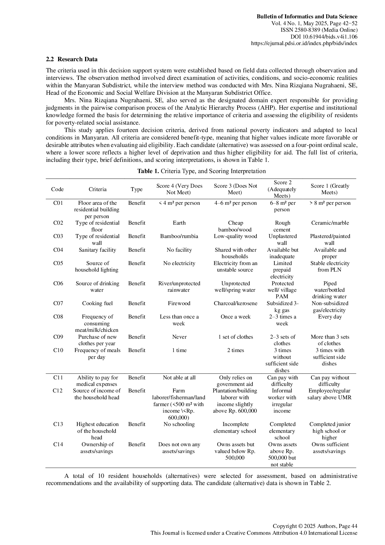 Bulletin of Informatics and Data ScienceBulletin of Informatics and Data SciencePoverty is a multidimensional problem that requires prompt and appropriate handling to maintain a dignified human life. In Manyaran Sub-district, Semarang City, the distribution of social assistance often faces obstacles due to limited human resources and a manual selection process for recipients. Therefore, a Decision Support System (DSS) is needed to assist the selection process in a more objective and efficient manner. This study aims to develop a DSS for determining social assistance recipients in Manyaran Sub-district by combining the Simple Multi-Attribute Rating Technique (SMART) and Analytical Hierarchy Process (AHP) methods. AHP is utilized to determine the weight of each criterion, while SMART is used to calculate the final score of each recipient candidate. The combination of SMART and AHP allows for both expert-based prioritization and quantitative evaluation, enhancing transparency and consistency in the selection process. The research was conducted through stages of problem analysis, data collection, literature review, system design, and report writing. The results show that among the ten analyzed candidates, the individual coded P06 achieved the highest final score of 0.574. The top five candidates with the highest scores were declared eligible to receive social assistance, while the others were declared ineligible. The application of the SMART and AHP methods in this DSS effectively improves the accuracy, objectivity, and efficiency of the selection process for social assistance recipients in Manyaran Sub-district.