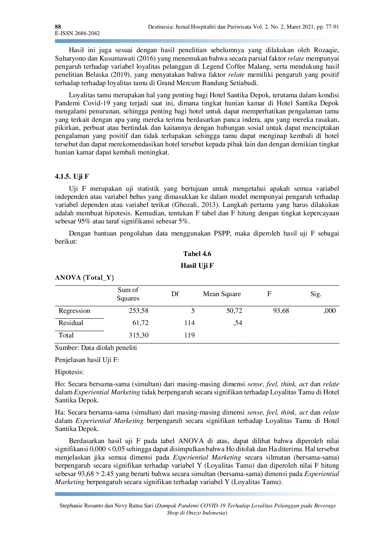 Penelitian ini menyimpulkan bahwa dimensi think, act, dan relate dalam experiential marketing berpengaruh signifikan terhadap loyalitas tamu di Hotel Santika Depok.Secara simultan, experiential marketing memberikan kontribusi signifikan terhadap loyalitas tamu, dengan tingkat pengaruh sebesar 80%.Oleh karena itu, Hotel Santika Depok perlu terus meningkatkan upaya penciptaan pengalaman tamu yang berfokus pada aspek pemikiran, tindakan, dan hubungan sosial untuk meningkatkan loyalitas tamu.