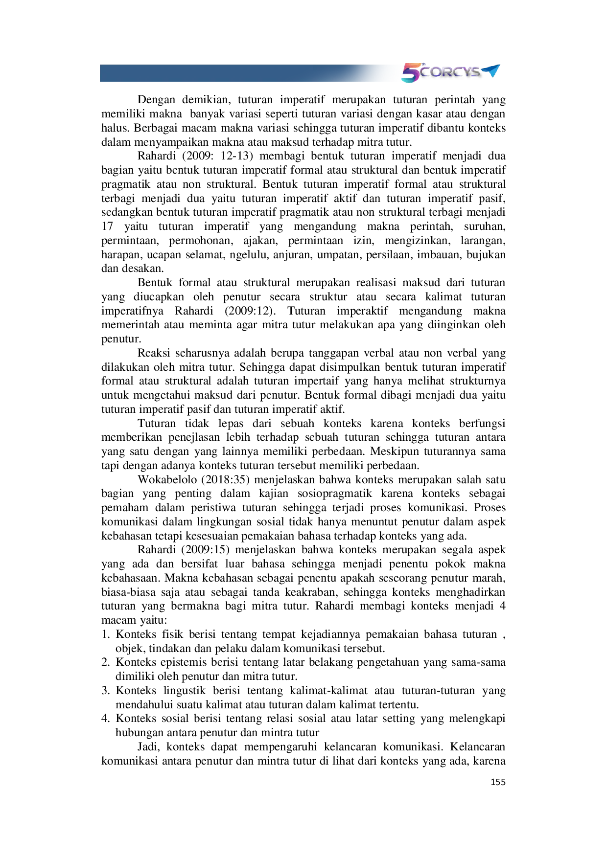 Prosiding Conference on Research and Community ServicesProsiding Conference on Research and Community ServicesPeneliti melakukan penelitian dengan judul tuturan imperatif dalam pembelajaran Bahasa Indonesia di SMP A.Wahid Hasyim Tebuireng Cukir Diwek Jombang karena SMP A. Wahid Hasyim merupakan salah satu sekolah formal yang berada di bawah naungan yayasan pondok pesantren Tebuireng atau yang biasa dikenal dengan sebutan yayasan KH. Hasyim Asyari, sehingga siswa dan guru tidak hanya dari wilayah Jombang tetapi dari berbagai wilayah seperti Kalimantan, Jakarta, Surabaya dan sebagainya. Terdiri dari berbagai wilayah menyebabkan tuturan-tuturan yang terjadi dalam pembelajaran beranekargam dengan bahasa-bahasa yang berbeda. Tujuannya adalah untuk mengetahui bentuk tuturan imperatif formal atau struktural dalam pembelajaran bahasa Indonesia di SMP A. Wahid Hasyim Tebuireng Cukir Diwek Jombang. Peneliti menggunakan jenis penelitian kualitatif berupa observasi atau pengamatan alami dengan metode deskriptif. Peneliti menemukan imperatif formal atau struktural aktif yang menggunakan penanda kesantunan imbuhan –lah dan imperatif formal atau struktural pasif yang menggunakan penanda kesantunan imbuhan -di dalam penelian yang telah dilakukan. Adapun setiap penanda kesantunan yang terdapat pada tuturan mempengaruhi tindak tutur yang terjadi.