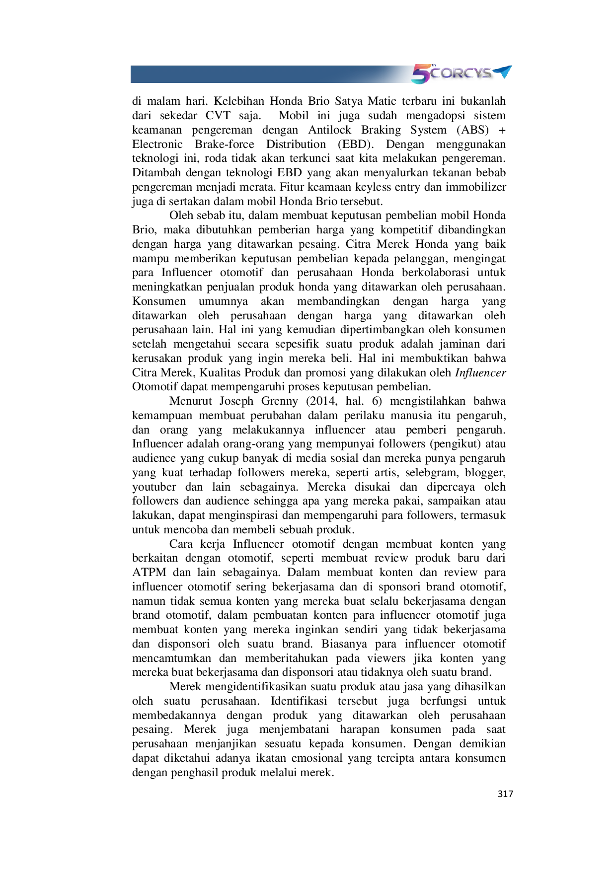 Prosiding Conference on Research and Community ServicesProsiding Conference on Research and Community ServicesPenelitian ini bertujuan untuk menguji dan mengetahui pengaruh citra merek, kualitas produk, dan influencer otomotif terhadap keputusan pembelian. Metode penelitian yang digunakan adalah metode kuantitatif yang bersifat asosiatif dengan menguji hipotesis. Sumber penelitian menggunakan data primer. Teknik pengambilan sampel dengan cara Random Sampling, dengan jumlah sampel yang diuji sebanyak 165 responden calon costumer atau yang sudah mempunyai mobil Honda Brio. Teknik pengumpulan data melalui Google Form pada calon pembeli maupun yang sudah membeli. Teknik analisis data yang digunakan dalam penelitian ini adalah Regresi Linier berganda menggunakan SPSS V. 22 Berdasarkan hasil dari penelitian ini menunjukan bahwa variable Citra Merek (X1), Kualitas produk (X2), dan Influencer Otomotif (X3) mampu berpengaruh signifikan terhadap variable keputusan pembelian.