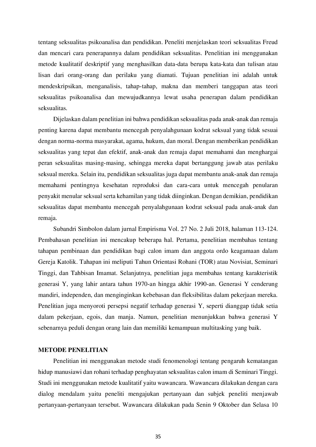 Nubuat : Jurnal Pendidikan Agama Kristen dan KatolikNubuat : Jurnal Pendidikan Agama Kristen dan KatolikPenelitian ini berfokus pada studi fenomenologis perjuangan gender calon seminari. Seksualitas dan selibat telah menjadi bahan perdebatan dan penelitian terus-menerus dalam konteks agama, khususnya dalam agama Katolik, di mana selibat merupakan bagian penting dari kehidupan spiritual para imam dan calon imam. Tujuan dari penelitian ini adalah untuk mengetahui persepsi dan pengalaman calon pendeta dalam mengembangkan kehidupan seksualnya. Metodologi yang digunakan dalam penelitian ini adalah studi fenomenologis dengan cara mewawancarai para pendeta perguruan tinggi. Dari sumber-sumber tersebut digali pengalaman mereka dalam mengelola seksualitas. Penelitian ini menyimpulkan bahwa kedewasaan kemanusiaan dan spiritual membuat seksualitas calon imam menjadi lebih sehat. Apresiasi yang sehat terhadap seksualitas menyebabkan calon imam bertumbuh dalam kecerdasan kemanusiaan, spiritual, intelektual, pastoral, dan komunal.