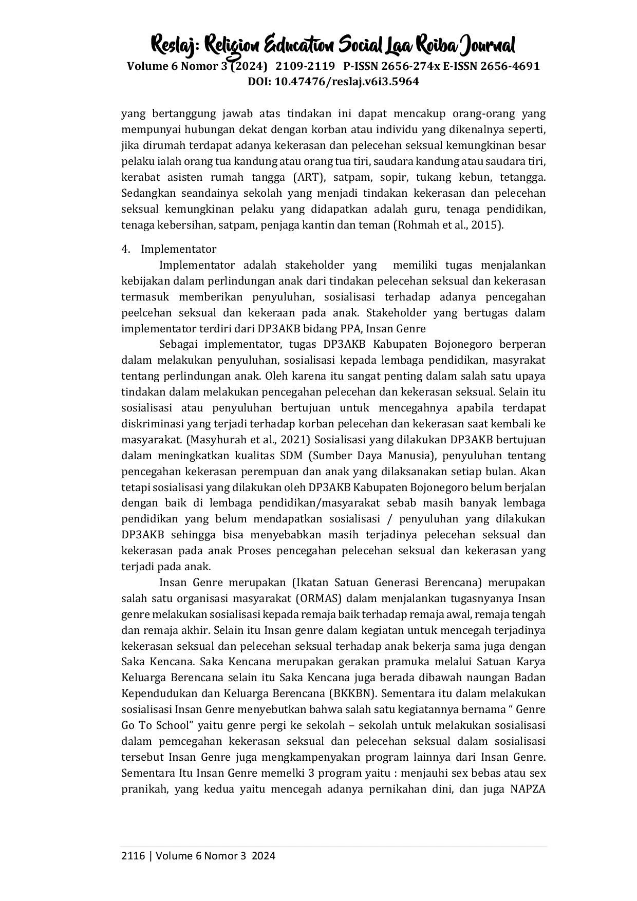 Reslaj : Religion Education Social Laa Roiba JournalReslaj : Religion Education Social Laa Roiba JournalBerlandaskan UU No. 35 Tahun 2014, anak diartikan sebagai seseorang yang belum mencapai umur 18 tahun, termasuk juga anak dalam kandungan. Anak juga rentan mendapatkan penderitaan baik secara fisik, sexual, mental, psikologis karena dianggap satu kelompok yang mudah dijadikan korban. Menurut meta analisis prevalensi pelecehan seksual terhadap anak Child Sexual Abuse (CSA) pada penelitian 24 negara antara 8 dari 31%, anak perempuan dan 3 dari 17% anak laki – laki. Riset ini bertujuan untuk menjelaskan keterlibatan pemangku kepentingan dalam mitigasi kekerasan dan pelecehan seksual pada anak di Kabupaten Bojonegoro. Peneliti menyelidiki isu signifikan mengenai kekerasan dan pelecehan seksual yang menyasar anak‑anak dan perempuan. Peneliti berharap agar riset ini bisa berfungsi sebagai sumber daya yang berharga untuk materi pendidikan dan sebagai referensi untuk memahami dan menerapkan strategi mitigasi pelecehan dan kekerasan seksual. Riset ini memanfaatkan desain deskriptif dengan memakai metodologi kualitatif. Riset ini memanfaatkan sumber data primer dan sekunder. Menggunakan teknik purposive sampling dalam pemilihan narasumber. Dinas Pemberdayaan Perlindungan Perempuan Anak sebagai policy creator. Polres unit PPA Kabupaten Bojonegoro dan Insan Genre sebagai coordinator, facilitator, implementer, akselerator. Akan tetapi semua pihak stakeholder tidak.