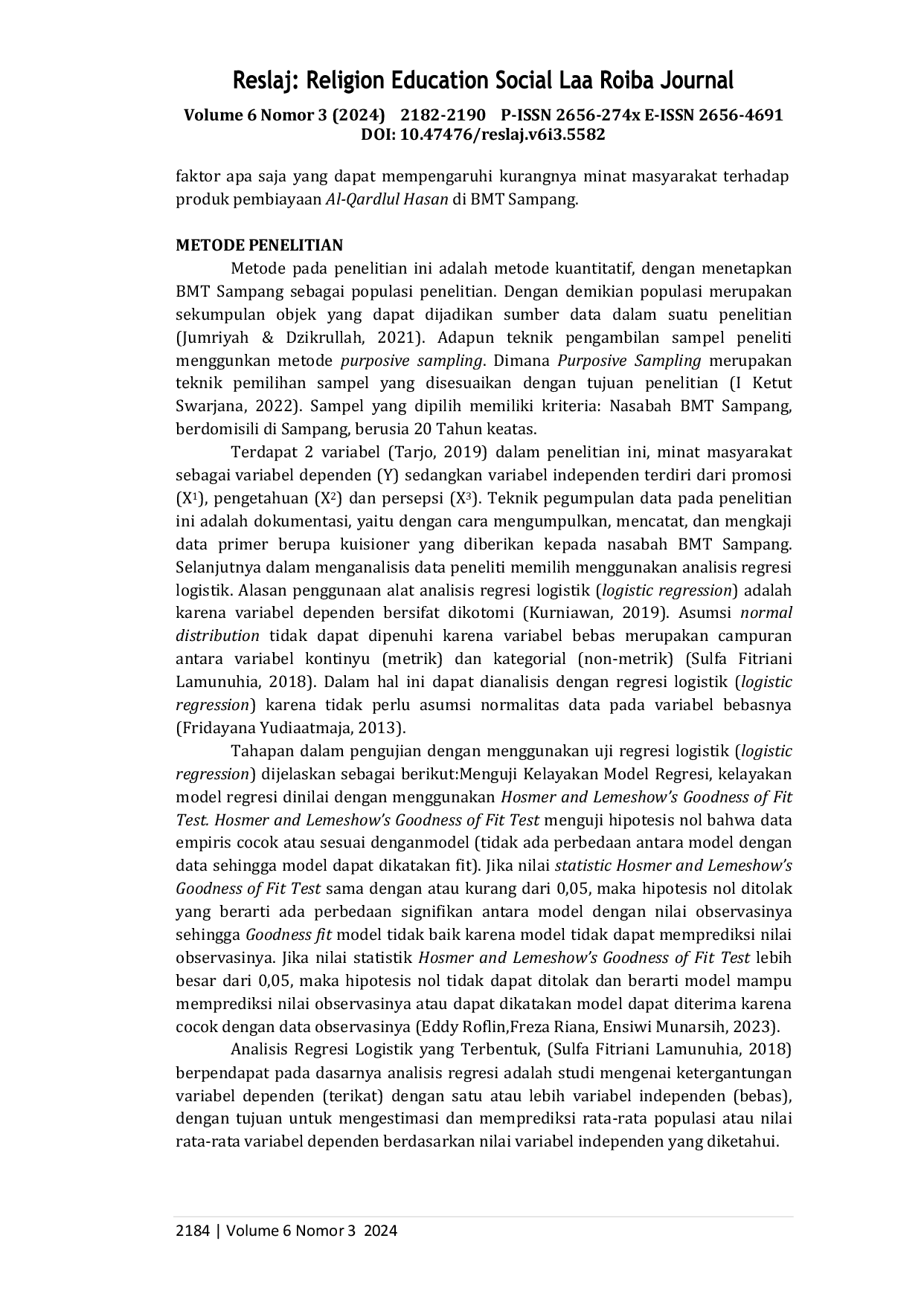 Reslaj : Religion Education Social Laa Roiba JournalReslaj : Religion Education Social Laa Roiba JournalPenelitian ini bertujuan untuk menganalisis pengaruh promosi, pengetahuan, dan persepsi terhadap minat masyarakat. Populasi dalam penelitian ini adalah BMT Sampang. Teknik pengambilan sampel menggunakan metode purposive sampling yang menghasilkan sebanyak 46 nasabah. Data dikumpulkan dengan menggunakan data primer dari nasabah yang terdaftar di BMT Sampang. Metode analisis data menggunakan analisis regresi logistik. Hasil penelitian ini menunjukkan bahwa variabel promosi dan variabel persepsi berpengaruh negatif terhadap minat masyarakat, sedangkan variabel pengetahuan berpengaruh positif terhadap minat masyarakat.