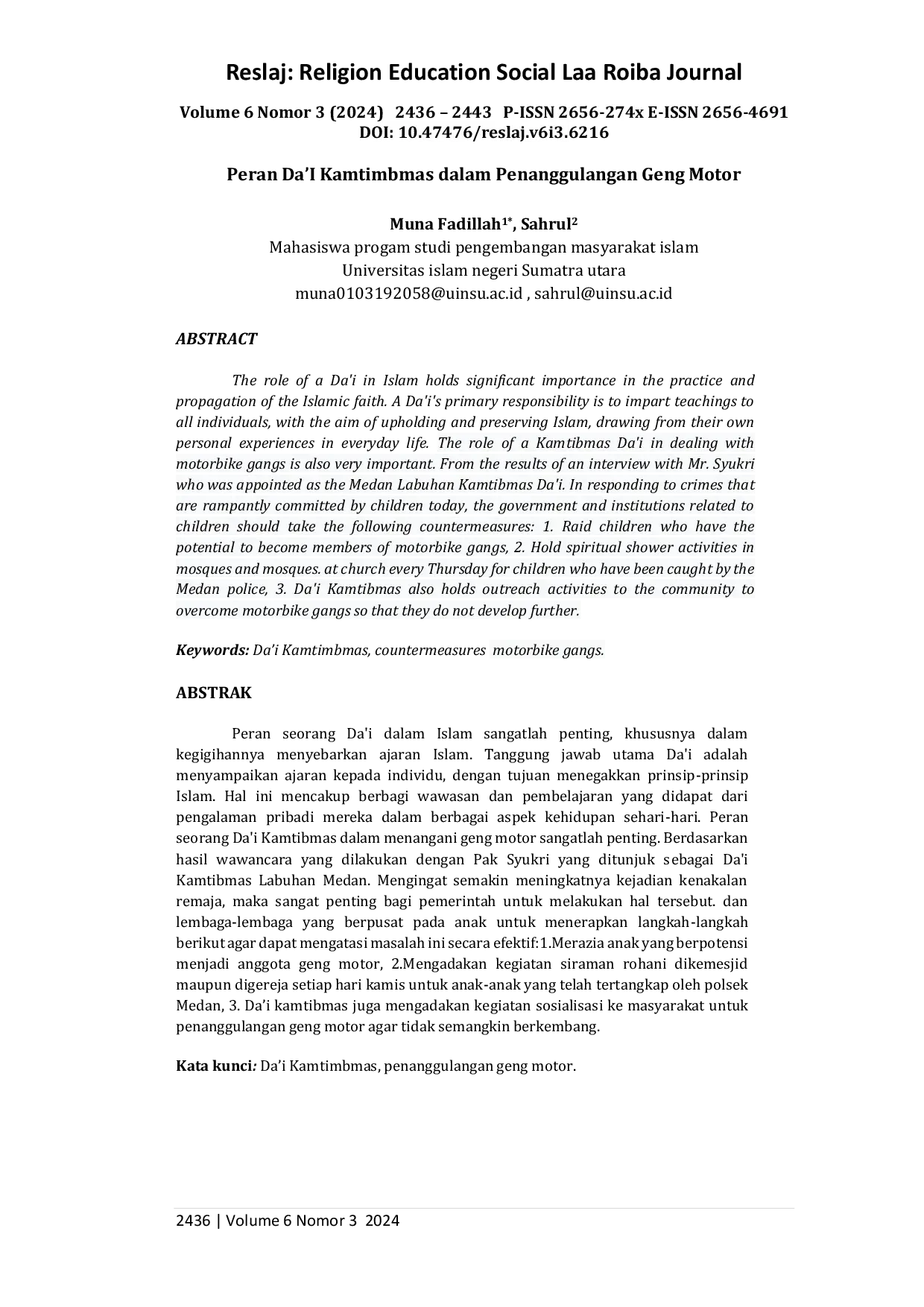 Reslaj : Religion Education Social Laa Roiba JournalReslaj : Religion Education Social Laa Roiba JournalPeran seorang Dai dalam Islam sangatlah penting, khususnya dalam kegiatnnya dalam menyebarkan ajaran Islam. Tanggung jawab utama Dai adalah menyampaikan ajaran kepada individu, dengan tujuan memajukan dan melestarikan prinsip-prinsip Islam, khususnya dengan mengambil pengalaman praktis dalam kehidupan sehari-hari. Peran seorang Dai Kamtibmas dalam menangani geng motor sangatlah penting. Berdasarkan hasil wawancara yang dilakukan dengan Pak Syukri yang ditunjuk sebagai Dai Kamtibmas Labuhan Medan. Mengingat semakin meningkatnya kejadian kenakalan remaja, maka sangat penting bagi pemerintah untuk melakukan hal tersebut dan lembaga-lembaga yang berpusat pada anak untuk menerapkan langkah-langkah berikut agar dapat mengatasi masalah ini secara efektif: 1. Merazia anak yang berpotensi menjadi anggota geng motor, 2. Mengadakan kegiatan siraman rohani di masjid maupun di gereja setiap hari Kamis untuk anak-anak yang telah tertangkap oleh polsek Medan, 3. Dai kamtibmas juga mengadakan kegiatan sosialisasi ke masyarakat untuk penanggulangan geng motor agar tidak semakin berkembang.