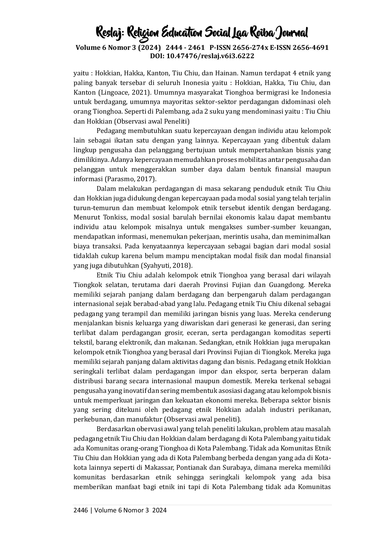 Reslaj : Religion Education Social Laa Roiba JournalReslaj : Religion Education Social Laa Roiba JournalPedagang Tionghoa merupakan salah satu dari banyaknya etnik berprofesi sebagai pengusaha di Indonesia yang telah mencapai kesuksesan di berbagai tempat di Indonesia termasuk di Kota Palembang, hal ini tidak terlepas dari modal kepercayaan yang telah ada turun temurun. Penelitian ini bertujuan untuk meng. Penelitian ini menggunakan metode kualitatif dengan jenis deskriptif. Hasil penelitian ini menunjukkan bahwa kepercayaan pada modal sosial memiliki peran penting dalam kemajuan dan keberlanjutan usaha yang dilakukan oleh etnik Tiu Chiu dan Hokkian dalam berdagang, dengan adanya kepercayaan antara sesama pedagang Tiu Chiu dan Hokkian memberikan peluang bagi pedagang etnik tersebut untuk berkembang. Kepercayaan, selain harus ditanamkan pada pedagang juga harus diberikan kepada pelanggan agar tetap percaya dan selalu membeli barang milik pedagang etnik Tiu Chiu dan Hokkian di Kawasan Pasar 16 Ilir Kota Palembang.
