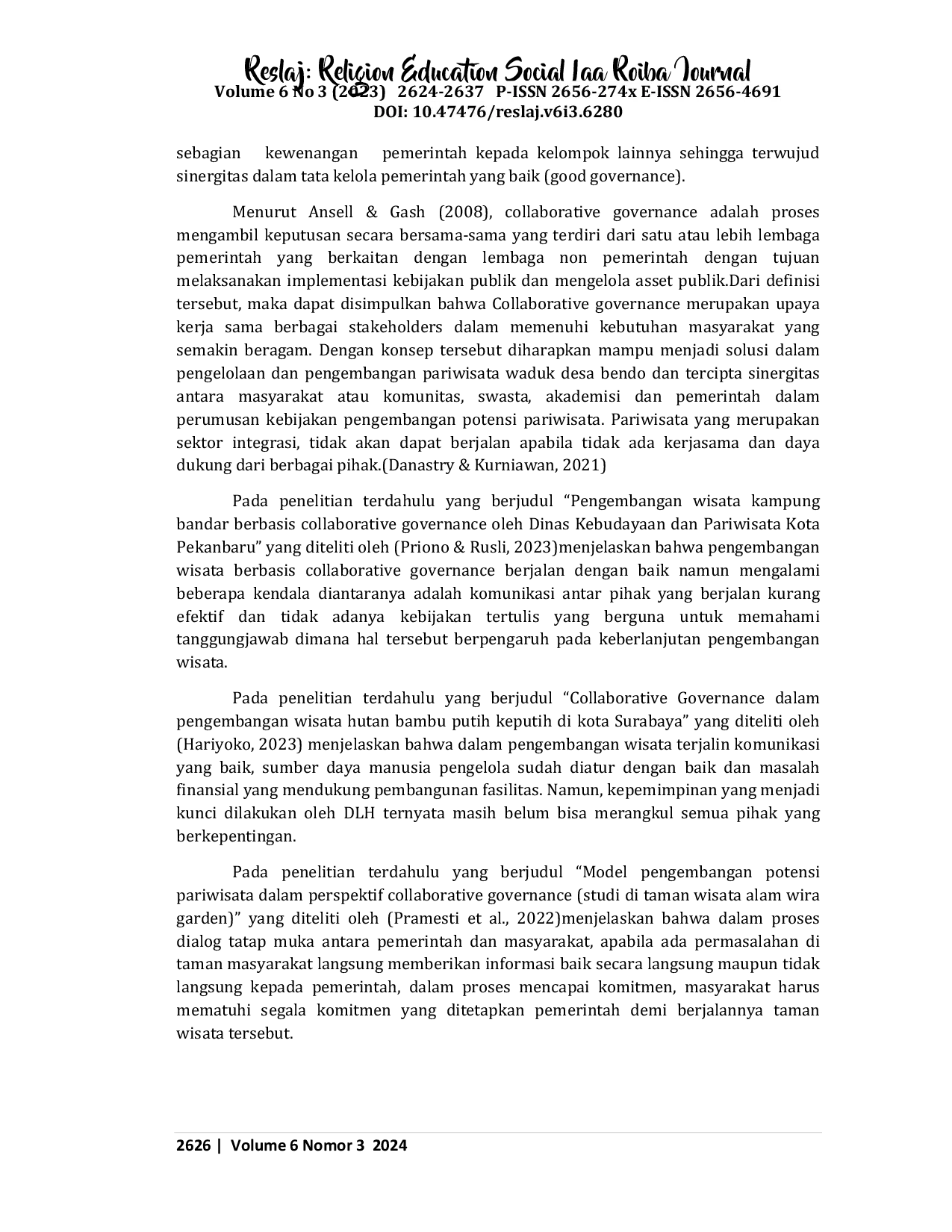 Reslaj : Religion Education Social Laa Roiba JournalReslaj : Religion Education Social Laa Roiba JournalKonsep collaborative governance menjelaskan bahwa pada dasarnya kebutuhan untuk berkolaborasi muncul dari adanya hubungan saling ketergantungan antar pihak. Keberhasilan proses pengembangan wisata tidak lepas dari adanya keterikatan antara stakeholders. Penelitian ini bertujuan untuk untuk mendeskripsikan bagaimana collaborative governance dalam proses pengembangan wisata waduk Bendo. Penelitian ini menggunakan metode penelitian kualitatif deskriptif danteknik pengumpulan data menggunakan studi lapangan yang dilakukan secara langsung terjun ke lokasi penelitian melalui observasi, wawancara dan dokumentasi. Penelitian ini menggunakan teori yang dikemukakan (Ratner,2012) yaitu : Identifying Obstacles and Opportunities, Debating Strategies For Influence, Planning Collaborative Action dan disempurnakan dengan kriteria keberhasilan(Goldsmith dan Kelttl, 2009:135-136).