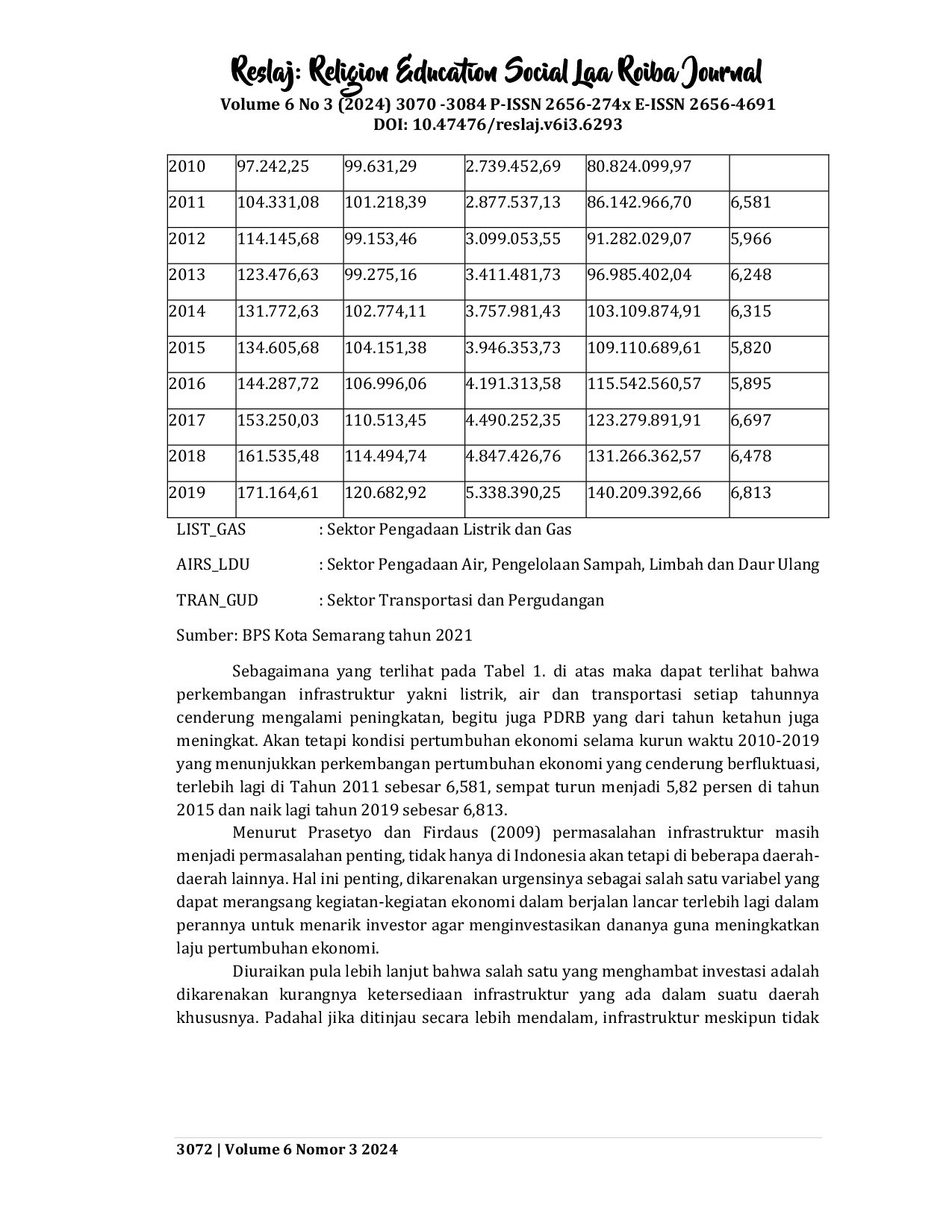 Reslaj : Religion Education Social Laa Roiba JournalReslaj : Religion Education Social Laa Roiba JournalPenelitian ini bertujuan untuk mengetahui pengaruh pembangunan infrastruktur terhadap pertumbuhan ekonomi di Kota Semarang. Data yang digunakan dalam penelitian ini adalah data sekunder berupa data time series periode 2010-2019 yang terdiri dari data PDRB harga konstan, data kelistrikan, air dan transportasi di Kota Semarang. Penelitian ini menggunakan analisis deskriptif kuantitatif dan regresi linier berganda. Perangkat lunak yang digunakan adalah SPSS 24.0. Hasil penelitian ini menunjukkan bahwa prasarana kelistrikan dan prasarana air mempunyai pengaruh yang signifikan terhadap pertumbuhan ekonomi di Kota Semarang dengan nilai signifikan 0,000 <0,05. Sedangkan Infrastruktur Ketenagalistrikan secara parsial berpengaruh positif dan signifikan terhadap pertumbuhan ekonomi nilai signifikan = 0,000 <0,05 dan infrastruktur air secara parsial berpengaruh positif dan signifikan terhadap pertumbuhan ekonomi dengan nilai signifikan = 0,000 <0,05. Dari hasil penelitian dapat disimpulkan bahwa pembangunan infrastruktur memiliki peran yang sangat penting dalam meningkatkan dan mendorong pertumbuhan ekonomi suatu daerah, pembangunan yang terjadi dapat berdampak baik terhadap proses kegiatan perekonomian. Khusus untuk infrastruktur transportasi harus dikaji oleh model ekonomi yang lain.