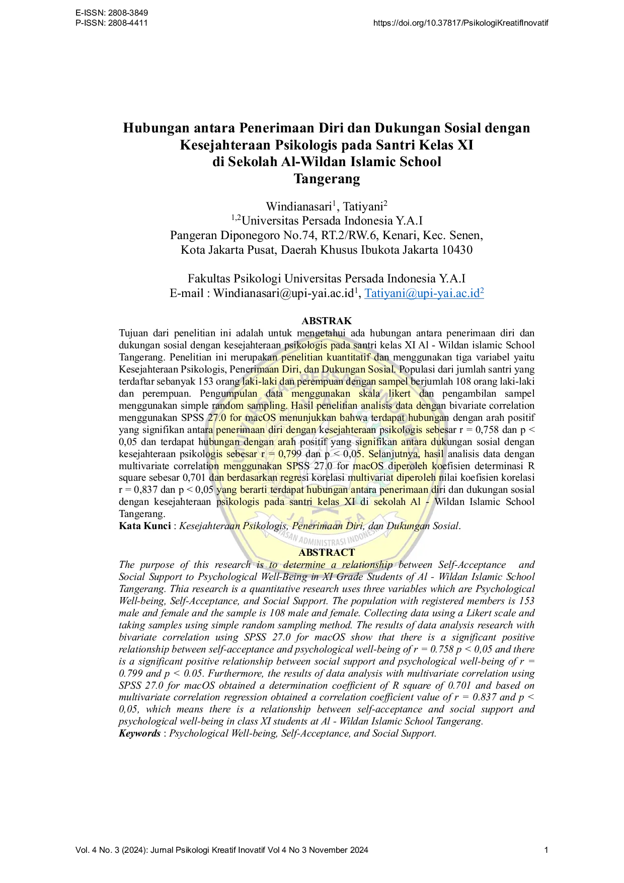 Psikologi Kreatif InovatifPsikologi Kreatif InovatifPenelitian ini bertujuan untuk mengetahui hubungan antara penerimaan diri dan dukungan sosial dengan kesejahteraan psikologis pada santri kelas XI di Sekolah Al-Wildan Islamic School Tangerang. Hasil penelitian menunjukkan bahwa terdapat hubungan yang signifikan dengan arah positif antara penerimaan diri dan dukungan sosial dengan kesejahteraan psikologis pada santri kelas XI di Sekolah Al-Wildan Islamic School Tangerang.