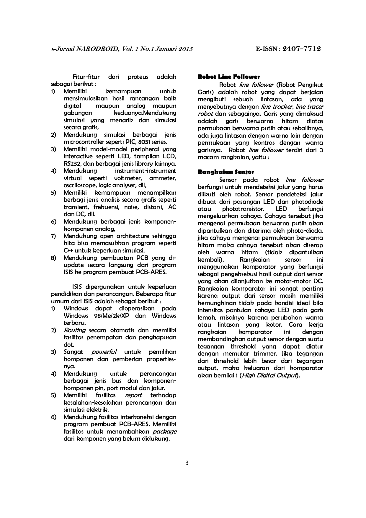 e-NARODROIDe-NARODROIDDi era globalisasi, ilmu pengetahuan dan teknologi berkembang pesat dan dimanfaatkan untuk membantu manusia menyelesaikan pekerjaan dengan lebih mudah dan efisien. Robot line follower merupakan salah satu penerapan teknologi yang dapat meringankan tugas manusia. Robot ini terdiri dari tiga bagian penting: sensor, komparator, dan driver. Penelitian ini bertujuan untuk membuat simulasi robot line follower sebelum diaplikasikan secara riil, sehingga proses pembuatan program dapat lebih efektif dan efisien.