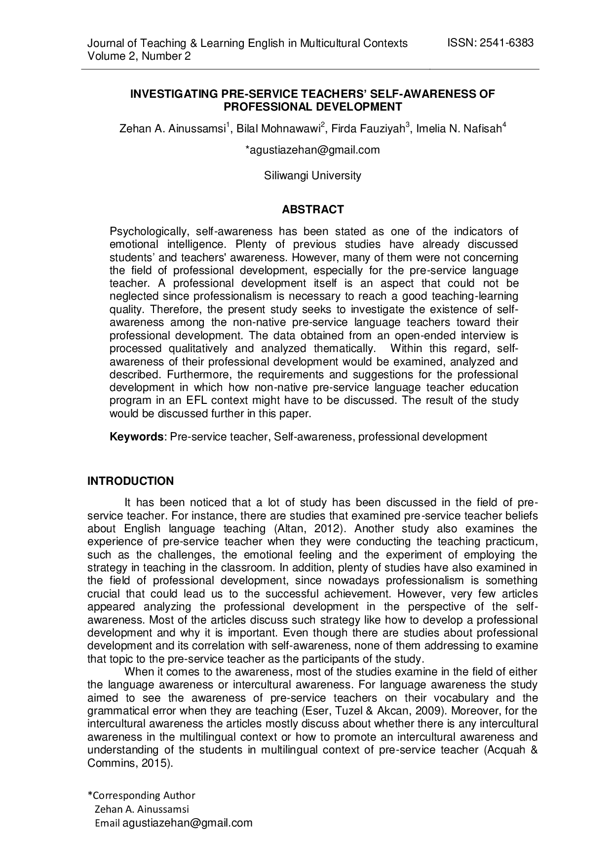 tlemctlemcSecara psikologis, kesadaran diri dianggap sebagai salah satu indikator kecerdasan emosional. Berbagai studi sebelumnya telah membahas kesadaran pada siswa dan guru, namun sebagian besar tidak menyentuh bidang pengembangan profesional, khususnya bagi guru bahasa pra‑layanan non‑native. Pengembangan profesional merupakan aspek yang tidak dapat diabaikan karena profesionalisme diperlukan untuk mencapai kualitas pembelajaran yang baik. Oleh karena itu, penelitian ini bertujuan meneliti keberadaan kesadaran diri pada guru bahasa pra‑layanan non‑native terhadap pengembangan profesional mereka. Data yang diperoleh melalui wawancara terbuka diproses secara kualitatif dan dianalisis secara tematik. Dalam konteks ini, kesadaran diri terkait pengembangan profesional akan dieksplorasi, dianalisis, dan dijelaskan. Selanjutnya, kebutuhan serta rekomendasi untuk pengembangan profesional dalam program pendidikan guru bahasa non‑native pada konteks EFL juga dibahas. Hasil penelitian akan dipaparkan lebih lanjut dalam makalah ini.