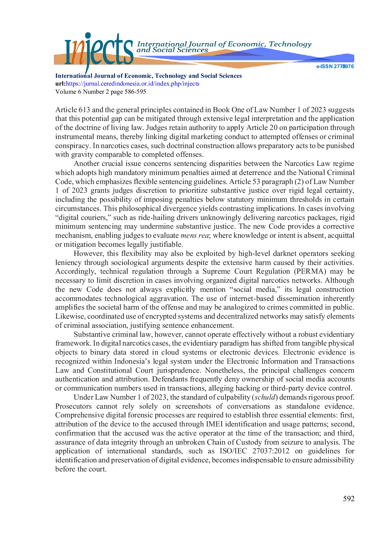 International Journal of Economic, Technology and Social Sciences (Injects)International Journal of Economic, Technology and Social Sciences (Injects)Penelitian ini didorong oleh konvergensi disrupsi teknologi digital, yang memunculkan fenomena Uberization of Drug Trafficking, dan reformasi hukum pidana nasional melalui pengesahan Undang-Undang Nomor 1 Tahun 2023 tentang Kitab Undang-Undang Hukum Pidana (KUHP). Studi ini bertujuan untuk menganalisis dinamika tindak pidana peredaran narkotika melalui media massa mulai dari web permukaan hingga darknet dalam kerangka hukum baru, serta untuk mengidentifikasi potensi celah impunitas akibat periode transisi regulasi. Metode penelitian yang digunakan adalah yuridis normatif dengan pendekatan perundang-undangan, konseptual, dan komparatif, bersumber dari data sekunder. Hasil penelitian menunjukkan bahwa pergeseran paradigma pemidanaan dalam KUHP dari retributif menjadi rehabilitatif dan restoratif memberikan diferensiasi tajam dalam penanganan antara penyalahguna dan sindikat. Namun, pencabutan ketentuan lex specialis tertentu dalam Undang-Undang Narkotika berpotensi menciptakan vakum hukum (rechtsvacuum) terkait tindak pidana transaksi elektronik jika tidak diantisipasi dengan interpretasi hukum progresif, khususnya melalui konstruksi alat perantara dan tanggung jawab pidana korporasi. Kompleksitas modus operandi yang memanfaatkan enkripsi end-to-end dan cryptocurrency menuntut reorientasi strategi penegakan hukum dari pendekatan konvensional menuju pendekatan Smart Power yang mengintegrasikan digital forensics, Kecerdasan Buatan (AI), dan kerja sama internasional yang solid.