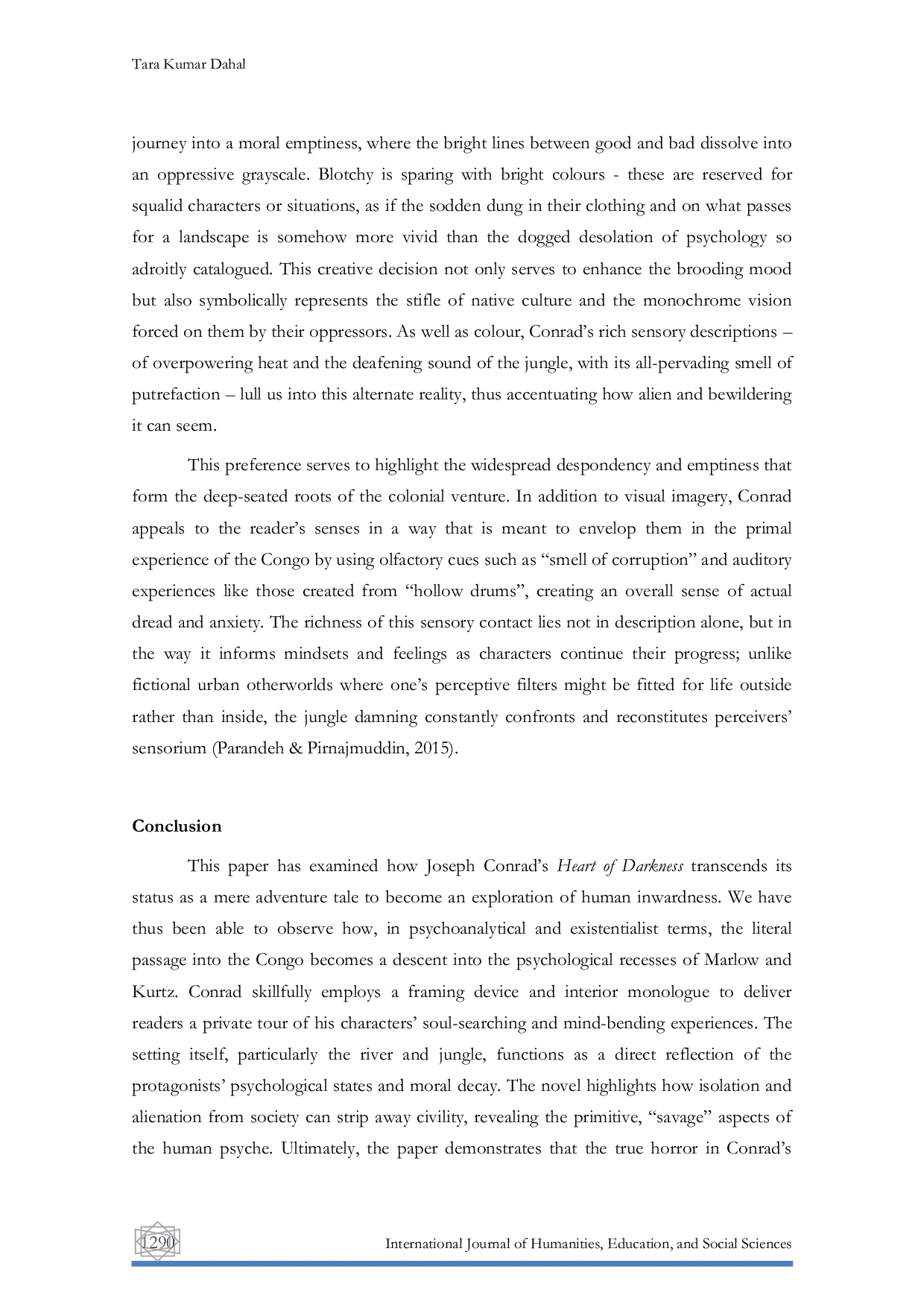 Penelitian ini menunjukkan bahwa Heart of Darkness melampaui cerita petualangan biasa untuk menjadi kajian mendalam tentang interioritas manusia melalui lensa psikoanalitik dan eksistensial, di mana perjalanan ke Kongo menjadi simbol penurunan ke dalam ruang psikologis Marlow dan Kurtz.Penggunaan perangkat naratif seperti framing dan monolog interior, serta latar alam yang mencerminkan kondisi psikologis, menyoroti bagaimana isolasi dan keterasingan mengungkap sisi primitif dan “liar dari jiwa manusia.Akhirnya, horor sejati dalam karya Conrad terletak pada keruntuhan mental yang mengganggu, bukan pada ancaman eksternal, ketika individu berhadapan dengan kegelapan internal mereka sendiri.