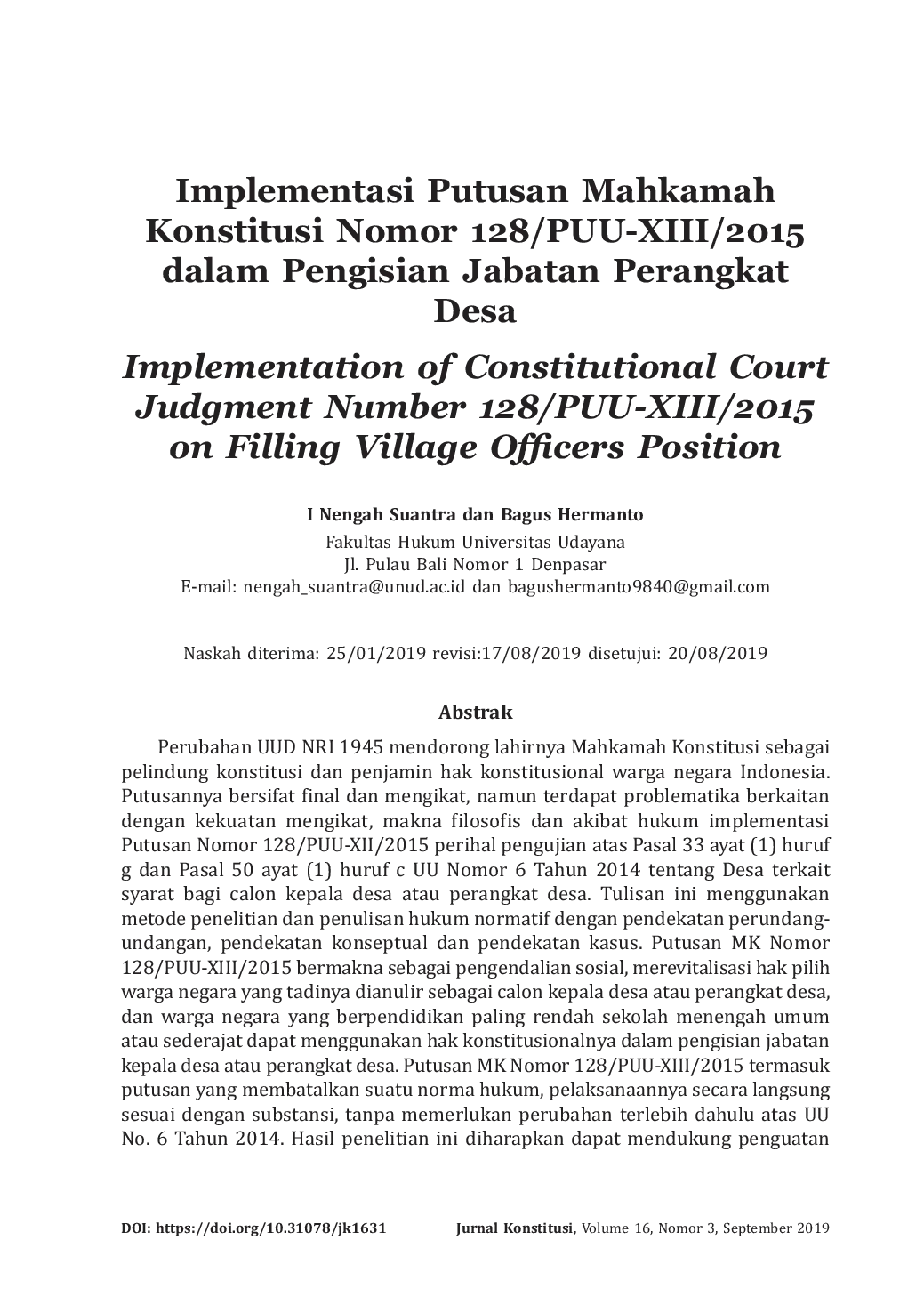 Jurnal KonstitusiJurnal KonstitusiPerubahan UUD NRI 1945 mendorong lahirnya Mahkamah Konstitusi sebagai pelindung konstitusi dan penjamin hak konstitusional warga negara Indonesia. Putusannya bersifat final dan mengikat, namun terdapat problematika berkaitan dengan kekuatan mengikat, makna filosofis dan akibat hukum implementasi Putusan Nomor 128/PUU-XII/2015 perihal pengujian atas Pasal 33 ayat (1) huruf g dan Pasal 50 ayat (1) huruf c UU Nomor 6 Tahun 2014 tentang Desa terkait syarat bagi calon kepala desa atau perangkat desa. Tulisan ini menggunakan metode penelitian dan penulisan hukum normatif dengan pendekatan perundang-undangan, pendekatan konseptual dan pendekatan kasus. Putusan MK Nomor 128/PUU-XIII/2015 bermakna sebagai pengendalian sosial, merevitalisasi hak pilih warga negara yang tadinya dianulir sebagai calon kepala desa atau perangkat desa, dan warga negara yang berpendidikan paling rendah sekolah menengah umum atau sederajat dapat menggunakan hak konstitusionalnya dalam pengisian jabatan kepala desa atau perangkat desa. Putusan MK Nomor 128/PUU-XIII/2015 termasuk putusan yang membatalkan suatu norma hukum, pelaksanaannya secara langsung sesuai dengan substansi, tanpa memerlukan perubahan terlebih dahulu atas UU No. 6 Tahun 2014. Hasil penelitian ini diharapkan dapat mendukung penguatan implementasi Putusan Mahkamah Konstitusi Nomor 128/PUU-XII/2015 dari aspek kekuatan mengikat, makna filosofis, dan akibat hukum implementasinya.