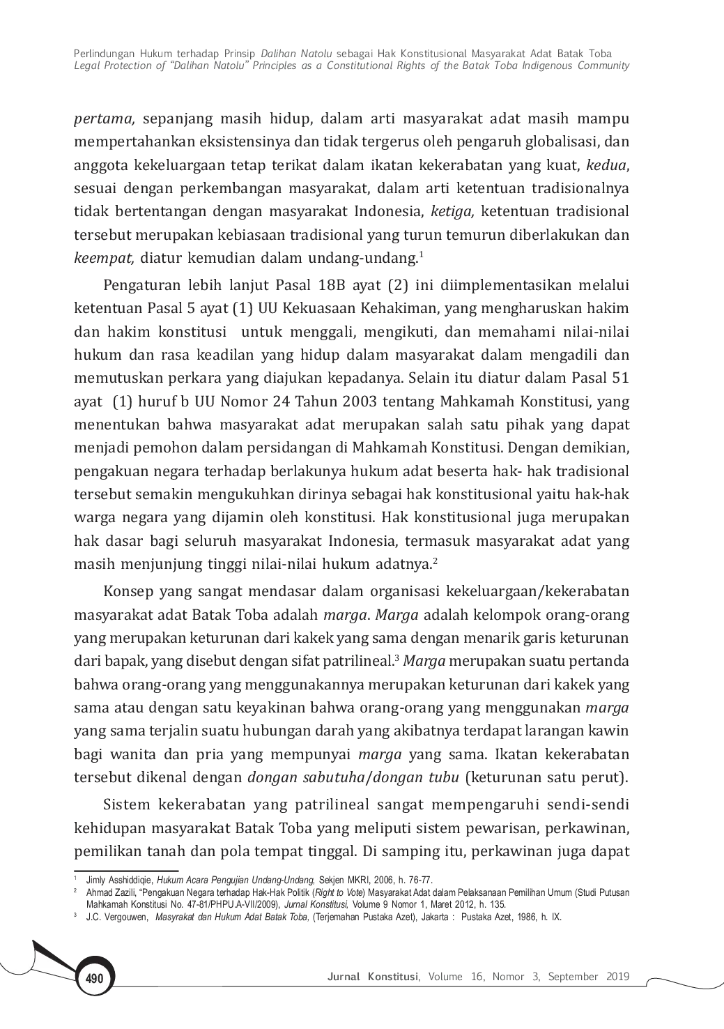 Jurnal KonstitusiJurnal KonstitusiPenelitian ini bertujuan untuk mengetahui perlindungan hukum terhadap hak konstitusional masyarakat dalam nilai hukum dalihan natolu sebagai bagian dari sistem hukum Indonesia untuk upaya penegakan hukum. Penelitian ini merupakan penelitian normatif-empiris. Titik beratnya adalah penelitian kepustakaan (library research), sedangkan studi hukum sebagai kenyataan (perilaku) yang bersifat empiris dilakukan melalui penelitian terhadap perilaku atau pola tingkah laku masyarakat yang menerapkan nilai hukum dalihan natolu sebagai hukum yang hidup (living law). Hasil penelitian menunjukkan bahwa perlindungan hukum terhadap hak masyarakat adat Batak Toba, dijamin secara konstitusional dalam Pasal 18 ayat (2) jo. Pasal 28 I ayat (3) UUD Negara Republik Indonesia sepanjang masih eksis sebagai sub sistem hukum Indonesia juga sebagai identitas budaya dan hak masyarakat tradisional yang merupakan hak asasi manusia yang harus dihormati.