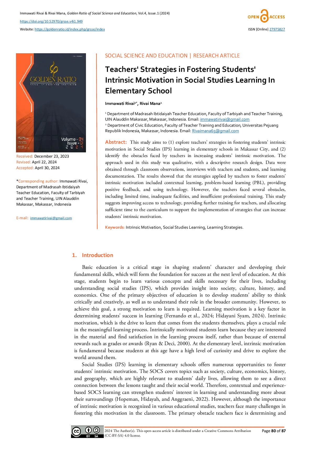 Golden Ratio of Social Science and EducationGolden Ratio of Social Science and EducationThis study aims to (1) explore teachers strategies in fostering students intrinsic motivation in Social Studies (IPS) learning in elementary schools in Makassar City, and (2) identify the obstacles faced by teachers in increasing students intrinsic motivation. The approach used in this study was qualitative, with a descriptive research design. Data were obtained through classroom observations, interviews with teachers and students, and learning documentation. The results showed that the strategies applied by teachers to foster students intrinsic motivation included contextual learning, problem-based learning (PBL), providing positive feedback, and using technology. However, the teachers faced several obstacles, including limited time, inadequate facilities, and insufficient professional training. This study suggests improving access to technology, providing further training for teachers, and allocating sufficient time to the curriculum to support the implementation of strategies that can increase students intrinsic motivation.