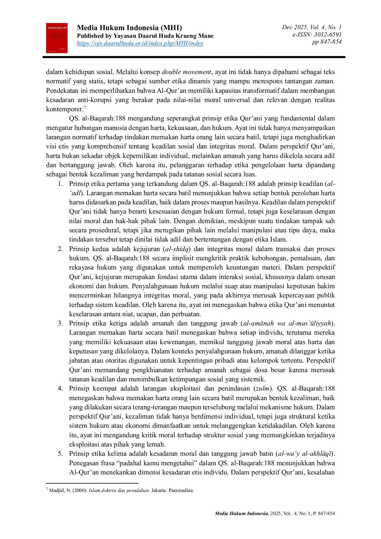 Media Hukum Indonesia (MHI)Media Hukum Indonesia (MHI)Korupsi merupakan persoalan multidimensional yang tidak hanya berkaitan dengan pelanggaran hukum positif, tetapi juga menyangkut krisis etika dan moralitas publik. Dalam konteks masyarakat Muslim, Al-Quran memiliki peran penting sebagai sumber nilai etika yang dapat dijadikan landasan dalam membangun sikap anti-korupsi. Artikel ini bertujuan untuk menganalisis QS. al-Baqarah:188 melalui perspektif hermeneutika Fazlur Rahman, khususnya dengan pendekatan double movement, guna menggali prinsip-prinsip etika Qurani yang relevan dengan upaya pencegahan dan pemberantasan korupsi. Penelitian ini menggunakan metode kualitatif dengan jenis penelitian kepustakaan (library research), dengan QS. al-Baqarah:188 sebagai sumber data utama yang dianalisis secara hermeneutik dan kontekstual. Hasil kajian menunjukkan bahwa ayat tersebut mengandung prinsip keadilan, kejujuran, amanah, larangan eksploitasi, dan supremasi nilai moral atas legalitas formal. Prinsip-prinsip ini menegaskan bahwa korupsi merupakan bentuk kezaliman dan pengkhianatan terhadap amanah sosial. Melalui pendekatan hermeneutika Fazlur Rahman, QS. al-Baqarah:188 dipahami sebagai sumber etika dinamis yang relevan untuk membangun kesadaran moral individu, budaya sosial yang berintegritas, serta sistem hukum yang berkeadilan dalam konteks kontemporer.
