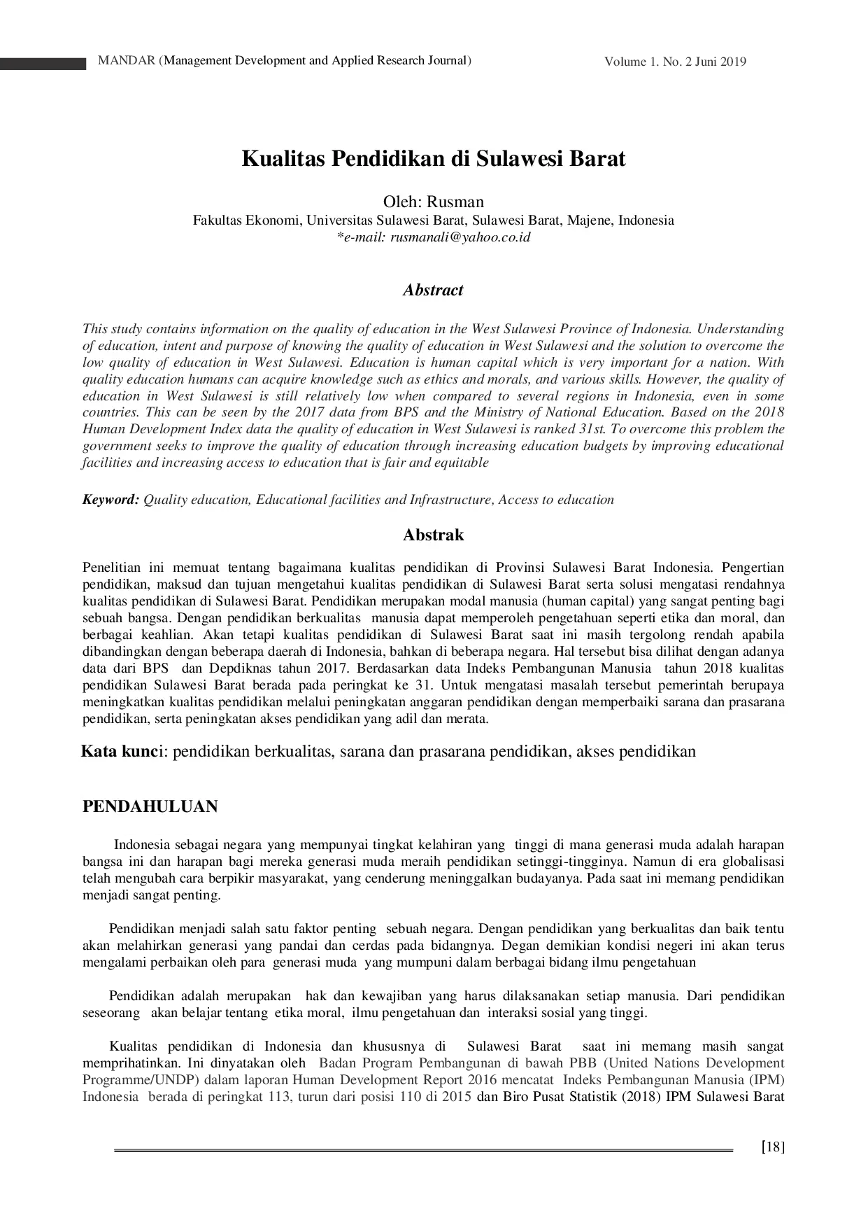MANDAR: Management Development and Applied Research JournalMANDAR: Management Development and Applied Research JournalPenelitian ini memuat tentang bagaimana kualitas pendidikan di Provinsi Sulawesi Barat Indonesia. Pengertian pendidikan, maksud dan tujuan mengetahui serta solusi mengatasi rendahnya . Pendidikan merupakan modal manusia (human capital) yang sangat penting bagi sebuah bangsa. Dengan pendidikan berkualitas manusia dapat memperoleh pengetahuan seperti etika dan moral, dan berbagai keahlian. Akan tetapi saat ini masih tergolong rendah apabila dibandingkan dengan beberapa daerah di Indonesia, bahkan di beberapa negara. Hal tersebut bisa dilihat dengan adanya data dari BPS dan Depdiknas tahun 2017. Berdasarkan data Indeks Pembangunan Manusia tahun 2018 kualitas pendidikan Sulawesi Barat berada pada peringkat ke 31. Untuk mengatasi masalah tersebut pemerintah berupaya meningkatkan kualitas pendidikan melalui peningkatan anggaran pendidikan dengan memperbaiki sarana dan prasarana pendidikan, serta peningkatan akses pendidikan yang adil dan merata.