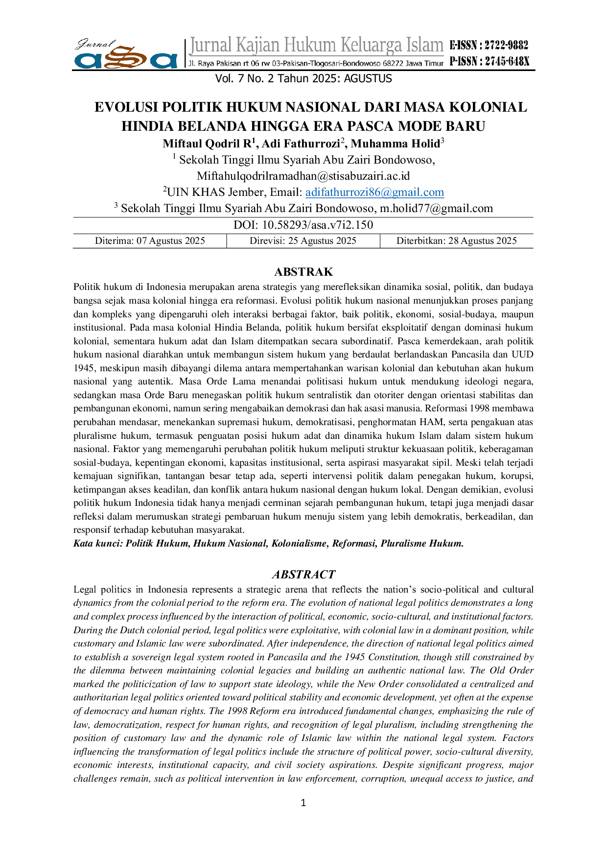 ASAASAPolitik hukum di Indonesia merupakan arena strategis yang merefleksikan dinamika sosial, politik, dan budaya bangsa sejak masa kolonial hingga era reformasi. Evolusi politik hukum nasional menunjukkan proses panjang dan kompleks yang dipengaruhi oleh interaksi berbagai faktor, baik politik, ekonomi, sosial-budaya, maupun institusional. Pada masa kolonial Hindia Belanda, politik hukum bersifat eksploitatif dengan dominasi hukum kolonial, sementara hukum adat dan Islam ditempatkan secara subordinatif. Pasca kemerdekaan, arah politik hukum nasional diarahkan untuk membangun sistem hukum yang berdaulat berlandaskan Pancasila dan UUD 1945, meskipun masih dibayangi dilema antara mempertahankan warisan kolonial dan kebutuhan akan hukum nasional yang autentik. Masa Orde Lama menandai politisasi hukum untuk mendukung ideologi negara, sedangkan masa Orde Baru menegaskan politik hukum sentralistik dan otoriter dengan orientasi stabilitas dan pembangunan ekonomi, namun sering mengabaikan demokrasi dan hak asasi manusia. Reformasi 1998 membawa perubahan mendasar, menekankan supremasi hukum, demokratisasi, penghormatan HAM, serta pengakuan atas pluralisme hukum, termasuk penguatan posisi hukum adat dan dinamika hukum Islam dalam sistem hukum nasional. Faktor yang memengaruhi perubahan politik hukum meliputi struktur kekuasaan politik, keberagaman sosial-budaya, kepentingan ekonomi, kapasitas institusional, serta aspirasi masyarakat sipil. Meski telah terjadi kemajuan signifikan, tantangan besar tetap ada, seperti intervensi politik dalam penegakan hukum, korupsi, ketimpangan akses keadilan, dan konflik antara hukum nasional dengan hukum lokal. Dengan demikian, evolusi politik hukum Indonesia tidak hanya menjadi cerminan sejarah pembangunan hukum, tetapi juga menjadi dasar refleksi dalam merumuskan strategi pembaruan hukum menuju sistem yang lebih demokratis, berkeadilan, dan responsif terhadap kebutuhan masyarakat.