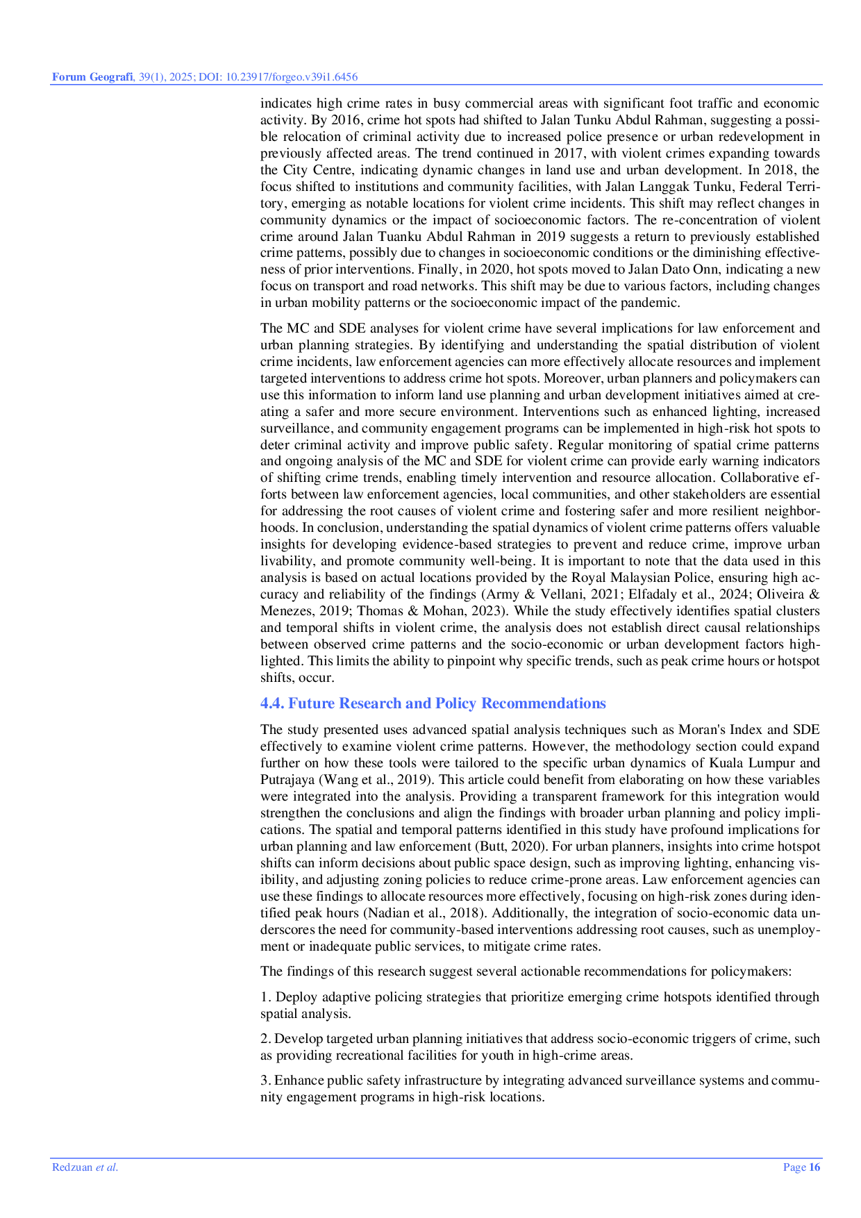 Forum GeografiForum GeografiArtikel ini menyelidiki pola kejahatan kekerasan di Kuala Lumpur dan Putrajaya antara tahun 2015 dan 2020 menggunakan teknik analisis spasial canggih, termasuk Autokorelasi Spasial, Elips Deviasi Standar (SDE), dan Mean Centre (MC). Studi ini menganalisis distribusi spasial dan dinamika temporal kejahatan kekerasan, melacak pergeseran hotspot kejahatan, dan memeriksa pengaruh faktor sosio-ekonomi terhadap pola-pola ini. Temuan mengungkapkan bahwa kejahatan kekerasan terutama terjadi pada sore hari dan malam hari, dengan puncak kejadian pada pukul 15.00 (1.830 kasus, 8,28%). Studi ini menyoroti pergeseran yang signifikan dalam hotspot kejahatan, awalnya terkonsentrasi di distrik komersial dan secara bertahap meluas ke jaringan transportasi dan kawasan perkotaan yang baru berkembang. Nilai Indeks Moran menunjukkan transisi dari pola yang hampir acak pada tahun 2015 (-0,002668) menjadi pengelompokan ringan pada tahun 2018 (0,032962). Selain itu, faktor sosio-ekonomi, termasuk kepadatan penduduk, kondisi ekonomi, dan pandemi COVID-19, berdampak signifikan pada pola kejahatan, menyebabkan perubahan dalam tingkat kejahatan dan lokasi hotspot.