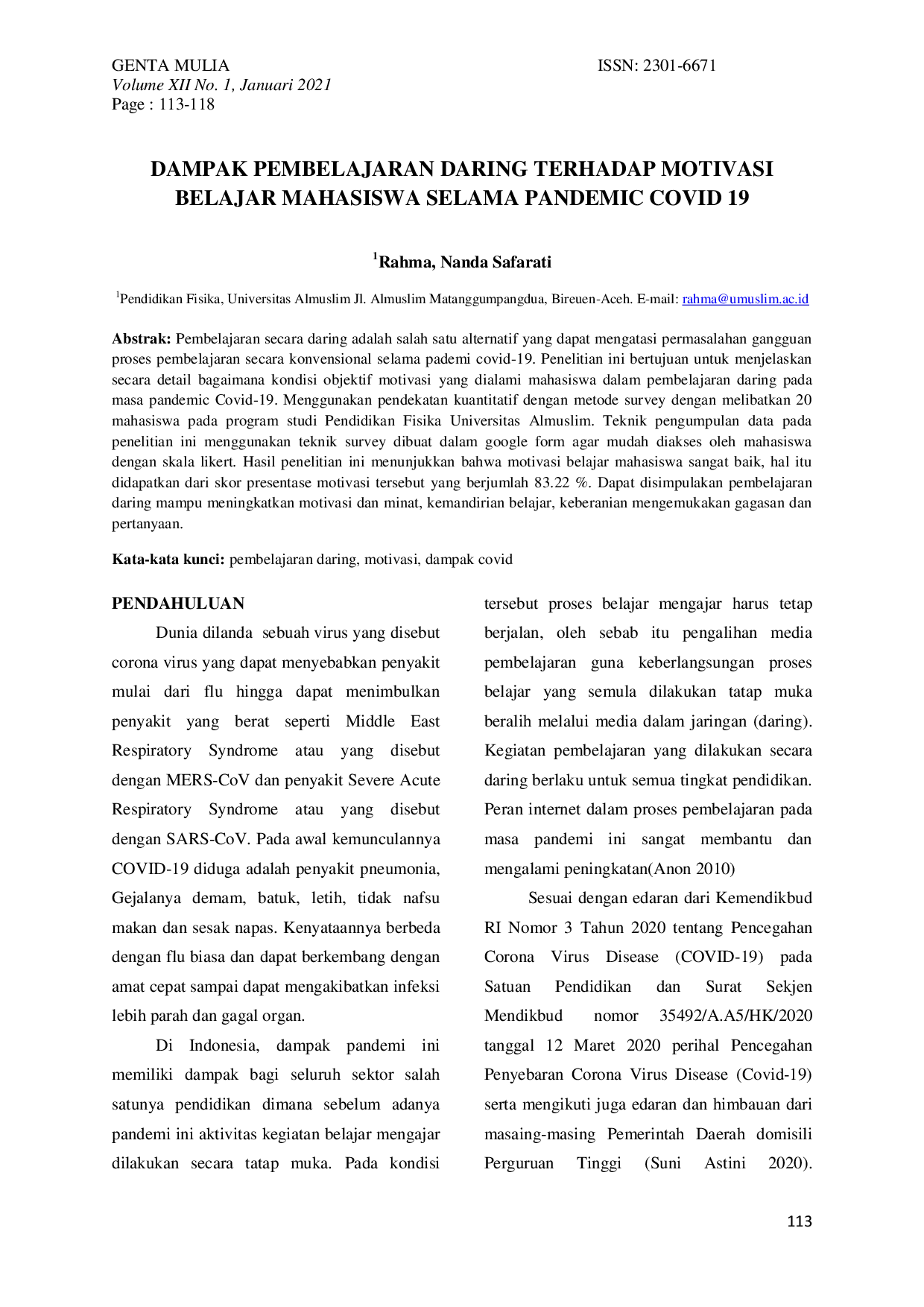 Jurnal Genta MuliaJurnal Genta MuliaPembelajaran secara daring adalah salah satu alternatif yang dapat mengatasi permasalahan gangguan proses pembelajaran secara konvensional selama pademi covid-19. Penelitian ini bertujuan untuk menjelaskan secara detail bagaimana kondisi objektif motivasi yang dialami mahasiswa dalam pembelajaran daring pada masa pandemic Covid-19. Menggunakan pendekatan kuantitatif dengan metode survey dengan melibatkan 20 mahasiswa pada program studi Pendidikan Fisika Universitas Almuslim. Teknik pengumpulan data pada penelitian ini menggunakan teknik survey dibuat dalam google form agar mudah diakses oleh mahasiswa dengan skala likert. Hasil penelitian ini menunjukkan bahwa motivasi belajar mahasiswa sangat baik, hal itu didapatkan dari skor presentase motivasi tersebut yang berjumlah 83.22 %. Dapat disimpulakan pembelajaran daring mampu meningkatkan motivasi dan minat, kemandirian belajar, keberanian mengemukakan gagasan dan pertanyaan.