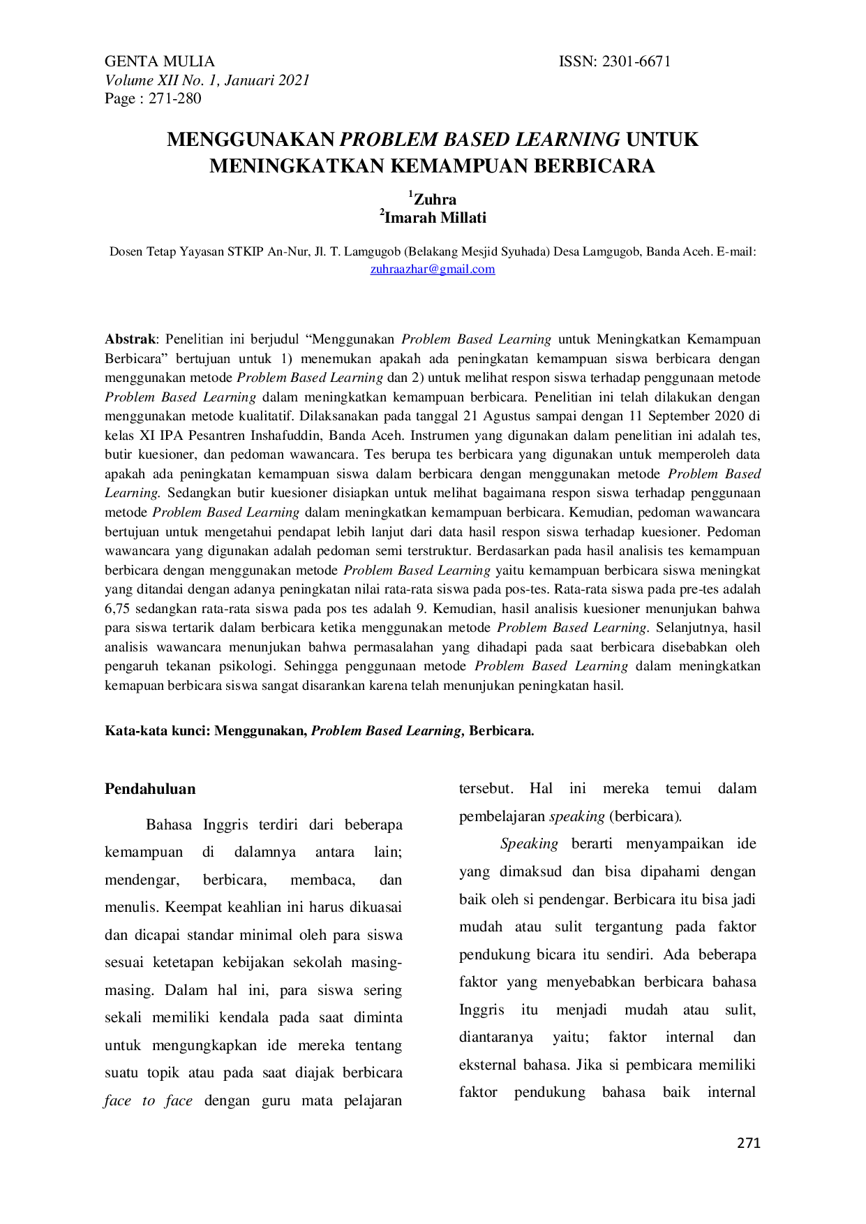 Jurnal Genta MuliaJurnal Genta MuliaPenelitian ini berjudul “ bertujuan untuk 1) menemukan apakah ada peningkatan kemampuan siswa berbicara dengan menggunakan metode Problem Based Learning dan 2) untuk melihat respon siswa terhadap penggunaan metode Problem Based Learning dalam meningkatkan kemampuan berbicara. Penelitian ini telah dilakukan dengan menggunakan metode kualitatif. Dilaksanakan pada tanggal 21 Agustus sampai dengan 11 September 2020 di kelas XI IPA Pesantren Inshafuddin, Banda Aceh. Instrumen yang digunakan dalam penelitian ini adalah tes, butir kuesioner, dan pedoman wawancara. Tes berupa tes berbicara yang digunakan untuk memperoleh data apakah ada peningkatan kemampuan siswa dalam berbicara dengan menggunakan metode Problem Based Learning. Sedangkan butir kuesioner disiapkan untuk melihat bagaimana respon siswa terhadap penggunaan metode Problem Based Learning dalam meningkatkan kemampuan berbicara. Kemudian, pedoman wawancara bertujuan untuk mengetahui pendapat lebih lanjut dari data hasil respon siswa terhadap kuesioner. Pedoman wawancara yang digunakan adalah pedoman semi terstruktur. Berdasarkan pada hasil analisis tes kemampuan berbicara dengan menggunakan metode Problem Based Learning yaitu kemampuan berbicara siswa meningkat yang ditandai dengan adanya peningkatan nilai rata-rata siswa pada pos-tes. Rata-rata siswa pada pre-tes adalah 6,75 sedangkan rata-rata siswa pada pos tes adalah 9. Kemudian, hasil analisis kuesioner menunjukan bahwa para siswa tertarik dalam berbicara ketika menggunakan metode Problem Based Learning. Selanjutnya, hasil analisis wawancara menunjukan bahwa permasalahan yang dihadapi pada saat berbicara disebabkan oleh pengaruh tekanan psikologi. Sehingga penggunaan metode Problem Based Learning dalam meningkatkan kemapuan berbicara siswa sangat disarankan karena telah menunjukan peningkatan hasil.