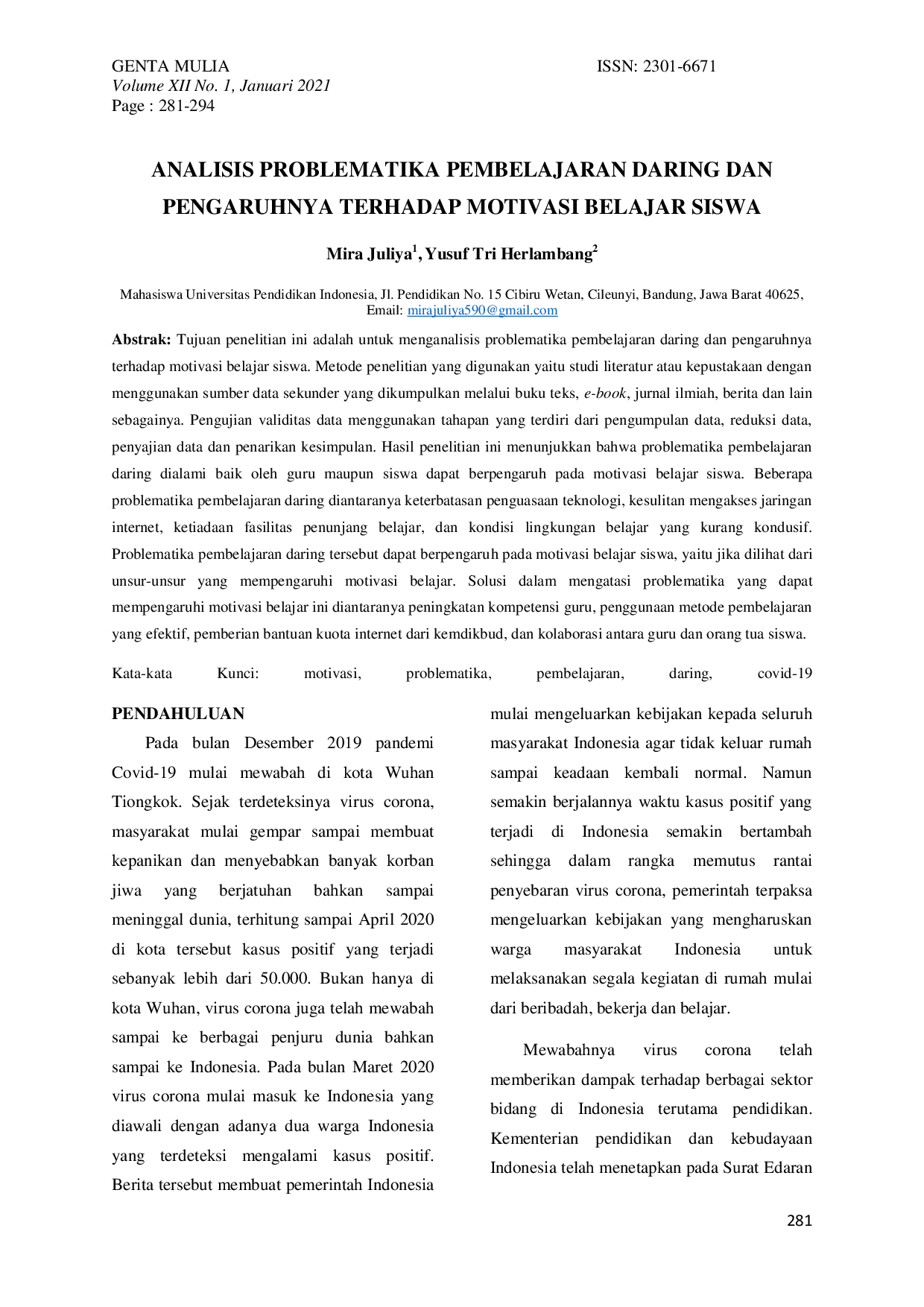 Jurnal Genta MuliaJurnal Genta MuliaTujuan penelitian ini adalah untuk meng. Metode penelitian yang digunakan yaitu studi literatur atau kepustakaan dengan menggunakan sumber data sekunder yang dikumpulkan melalui buku teks, e-book, jurnal ilmiah, berita dan lain sebagainya. Pengujian validitas data menggunakan tahapan yang terdiri dari pengumpulan data, reduksi data, penyajian data dan penarikan kesimpulan. Hasil penelitian ini menunjukkan bahwa problematika pembelajaran daring dialami baik oleh guru maupun siswa dapat berpengaruh pada motivasi belajar siswa. Beberapa problematika pembelajaran daring diantaranya keterbatasan penguasaan teknologi, kesulitan mengakses jaringan internet, ketiadaan fasilitas penunjang belajar, dan kondisi lingkungan belajar yang kurang kondusif. Problematika pembelajaran daring tersebut dapat berpengaruh pada motivasi belajar siswa, yaitu jika dilihat dari unsur-unsur yang mempengaruhi motivasi belajar siswa. Solusi dalam mengatasi problematika yang dapat mempengaruhi motivasi belajar ini diantaranya peningkatan kompetensi guru, penggunaan metode pembelajaran yang efektif, pemberian bantuan kuota internet dari kemdikbud, dan kolaborasi antara guru dan orang tua siswa.