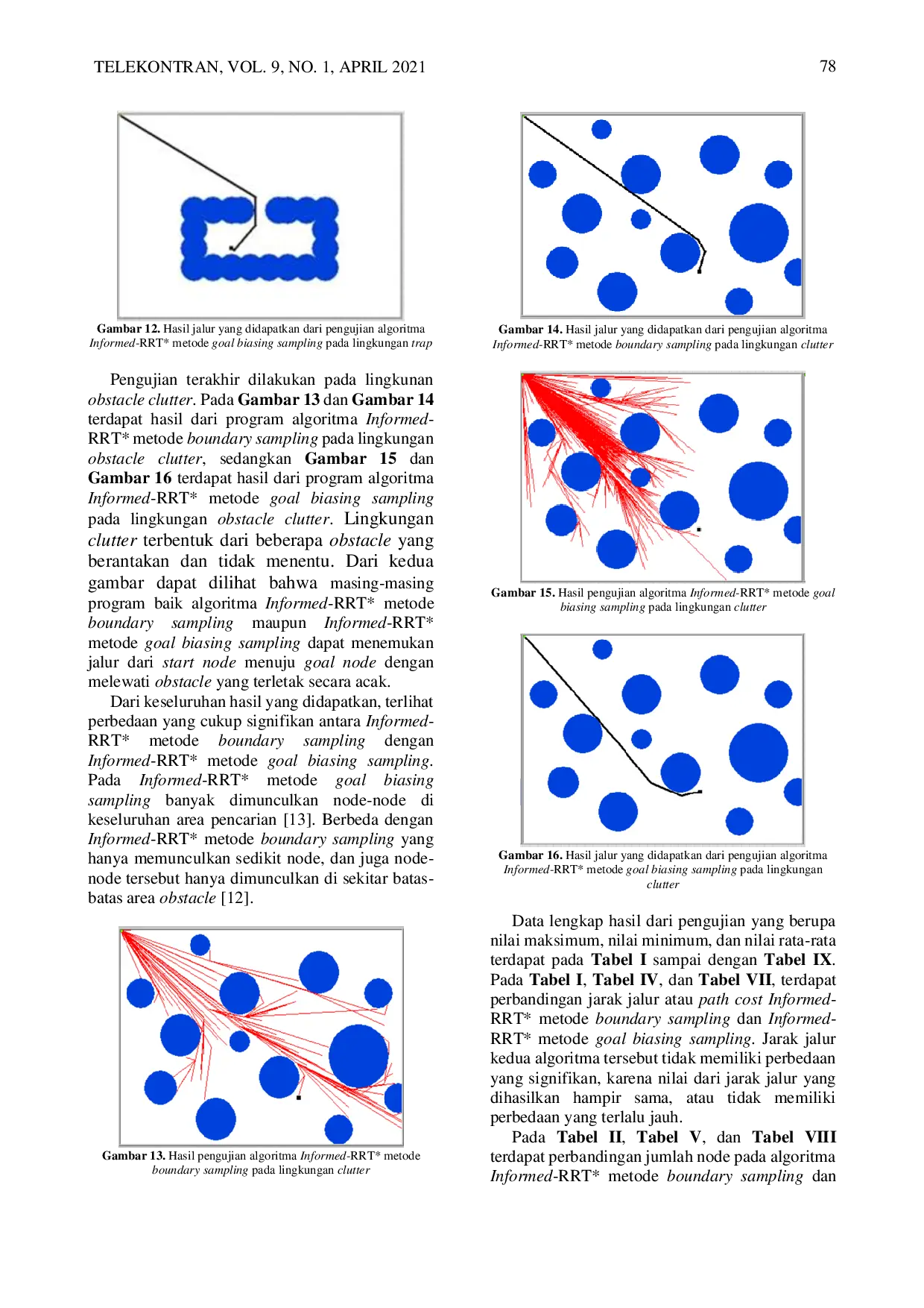 Telekontran : Jurnal Ilmiah Telekomunikasi, Kendali dan Elektronika TerapanTelekontran : Jurnal Ilmiah Telekomunikasi, Kendali dan Elektronika TerapanPerencanaan jalur merupakan salah satu program penunjang untuk robotika atau kendaraan. Pada perencanaan jalur dibutuhkan algoritma yang tepat agar mendapatkan hasil yang optimal. Algoritma Informed Rapidly-exploring Random Tree* (Informed-RRT*) merupakan algoritma untuk perencanaan jalur yang berbasis sampling atau pengambilan sampel acak pada ruang pencarian. Pada penelitian ini akan dilakukan analisis performansi algoritma Informed-RRT* dengan metode boundary sampling dan Informed-RRT* metode goal biasing sampling. Tujuan penelitian ini yaitu membandingkan kedua algoritma tersebut untuk mendapatkan algoritma dengan performansi terbaik dalam melakukan perencanaan jalur. Pengujian dilakukan berbasis simulasi menggunakan software Labview. Dalam pengujian ini digunakan beberapa kasus lingkungan obstacle yang ada, yaitu lingkungan narrow, trap dan clutter. Kriteria untuk menentukan performansi yang optimal yaitu jarak jalur (path cost), waktu komputasi, dan jumlah node. Dari hasil yang didapatkan, nilai rata-rata algoritma Informed-RRT* metode boundary sampling menghasilkan waktu komputasi yang lebih cepat dan juga jumlah node yang lebih sedikit dibandingkan dengan Informed-RRT* metode goal biasing sampling, sedangkan untuk jarak jalur algoritma dengan kedua metode tersebut memiliki hasil yang hampir sama. Dapat disimpulkan bahwa algoritma Informed-RRT* metode boundary sampling memiliki performansi lebih optimal dibandingkan dengan algoritma Informed-RRT* metode goal biasing sampling.