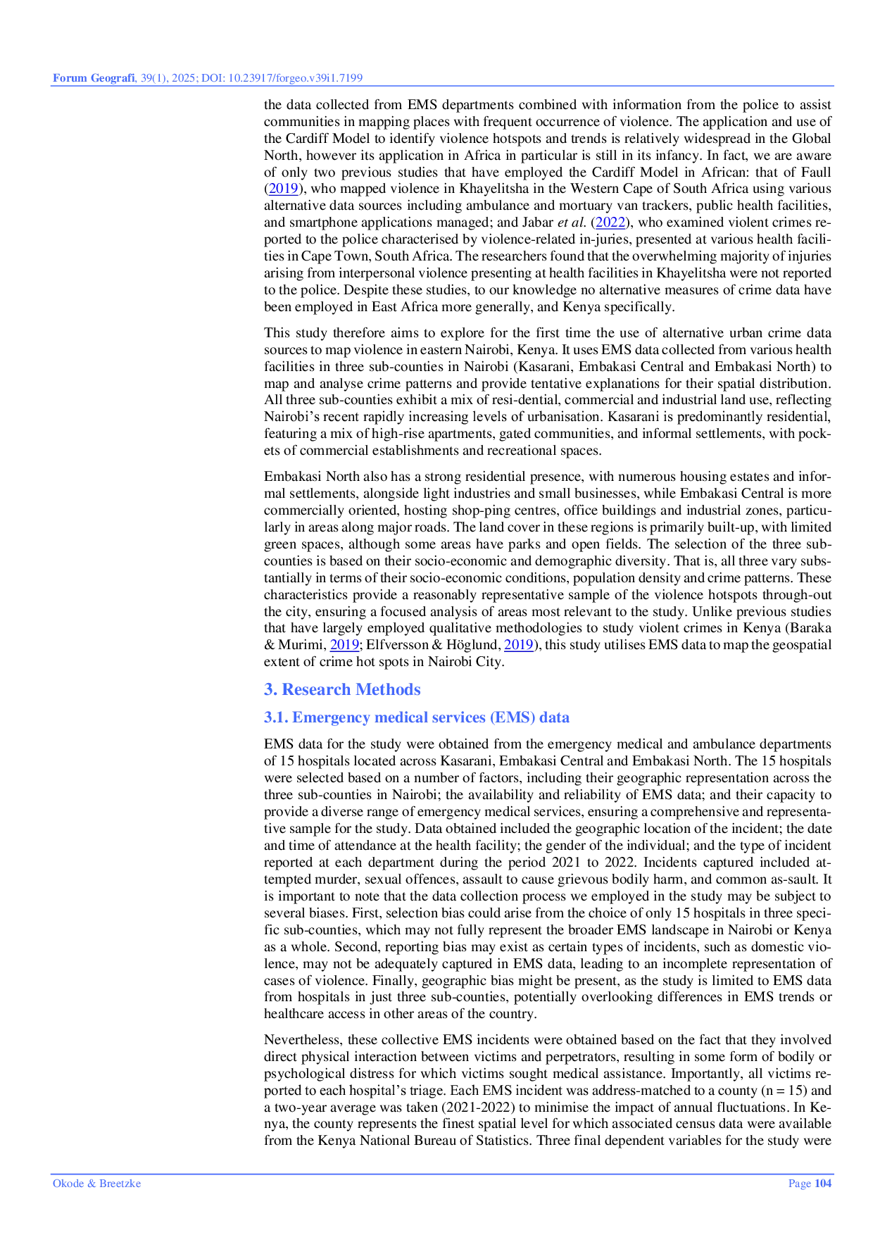 Forum GeografiForum GeografiStudi ini menyelidiki penggunaan data layanan medis darurat (EMS) sebagai sumber alternatif untuk memetakan dan memahami kekerasan di Nairobi, Kenya. Karena banyak kejahatan yang tidak dilaporkan, mengandalkan data polisi saja dapat menciptakan gambaran yang tidak lengkap tentang titik panas kekerasan. Menggunakan teori disorganisasi sosial sebagai kerangka teoritis, studi ini menggunakan data EMS dari lima belas rumah sakit di tiga sub-kabupaten Nairobi untuk memetakan kekerasan dan menganalisis pola spasialnya. Digunakan model regresi spasial untuk menilai pengaruh lima variabel disorganisasi sosial - pengangguran, pendidikan, gender, mobilitas penduduk, dan demografi pemuda - terhadap tingkat kekerasan, disagregasi berdasarkan gender. Temuan menunjukkan bahwa pengangguran berkorelasi positif dengan kekerasan, terutama di kalangan perempuan, sementara persentase pemuda yang lebih tinggi secara tidak terduga terkait dengan tingkat kekerasan yang lebih rendah. Studi ini menunjukkan nilai data EMS untuk pemetaan kejahatan dalam konteks dengan tingkat kejahatan yang tidak dilaporkan tinggi dan menawarkan wawasan tentang distribusi spasial kekerasan di Nairobi, meningkatkan pemahaman tentang sumber data kejahatan alternatif di pengaturan perkotaan Afrika. Pendekatan ini menekankan kegunaan data EMS untuk menginformasikan strategi pencegahan kekerasan yang lebih terarah di daerah di mana data kejahatan tradisional terbatas.