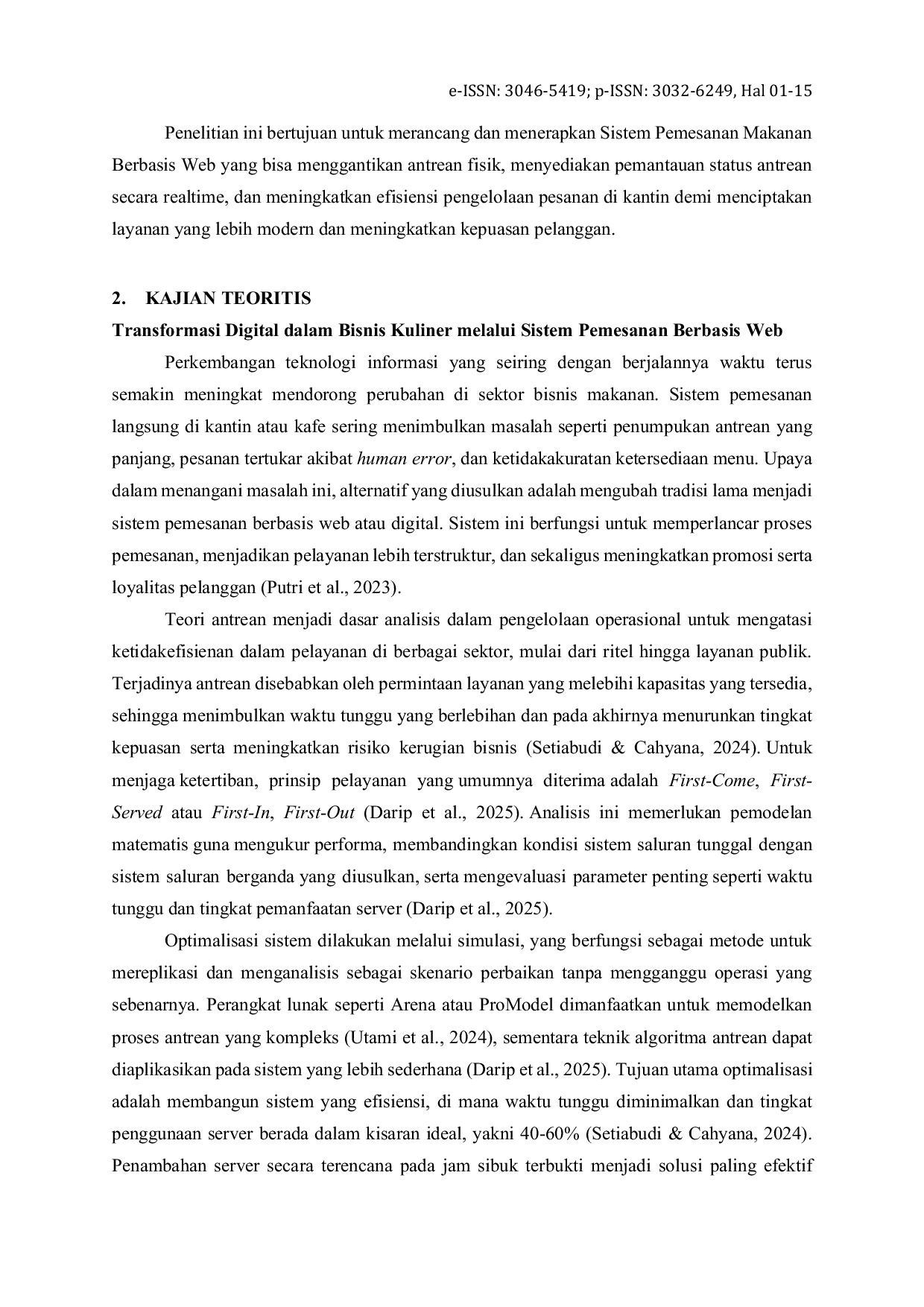 Polygon : Jurnal Ilmu Komputer dan Ilmu Pengetahuan AlamPolygon : Jurnal Ilmu Komputer dan Ilmu Pengetahuan AlamAntrean fisik yang panjang dan tidak terkelola dalam sistem pemesanan makanan tradisional, khususnya di kantin, telah menjadi sumber utama ketidaknyamanan bagi pelanggan dan menurunkan efisiensi layanan secara drastis. Model pemesanan konvensional ini sering memicu penumpukan orang, perpanjangan waktu tunggu yang tidak dapat diprediksi, bahkan terkadang memicu gesekan antara pengunjung. Untuk mengatasi tantangan operasional ini dan secara substansial meningkatkan kepuasan pengguna, penelitian ini mengusulkan pengembangan dan implementasi Sistem Pemesanan Makanan Berbasis Web yang inovatif. Platform digital ini memberikan pelanggan kemampuan untuk memesan menu secara online sepenuhnya, menghilangkan keharusan untuk berdiri dan mengantre di lokasi. Inti dari sistem ini adalah fitur pemantauan status pesanan dan posisi antrean secara realtime, yang menampilkan informasi transparan langsung di gawai pelanggan. Di sisi operasional, aplikasi ini bertindak sebagai alat bantu krusial bagi staf kantin, menyediakan pengelolaan pesanan yang terintegrasi dan terorganisir, yang memungkinkan penyiapan makanan dilakukan lebih akurat dan tepat waktu. Dengan mengubah proses pemesanan menjadi alur kerja digital, sistem ini diharapkan mampu mempercepat siklus layanan, menghilangkan kerumunan yang tidak perlu, serta secara signifikan meningkatkan kepuasan pelanggan melalui pengalaman yang tertata rapi, modern, dan sangat efisien. Inisiatif ini menandai lompatan menuju layanan makanan yang lebih responsif dan cerdas.