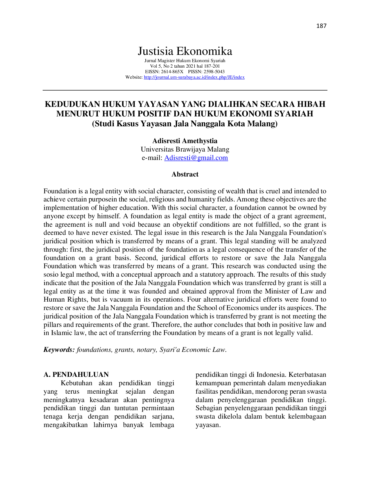 Jurnal Justisia Ekonomika: Magister Hukum Ekonomi SyariahJurnal Justisia Ekonomika: Magister Hukum Ekonomi SyariahYayasan merupakan entitas hukum berbadan sosial yang terdiri atas kekayaan yang dipisahkan dan ditujukan untuk mencapai tujuan tertentu di bidang sosial, keagamaan, dan kemanusiaan. Dalam konteks pendidikan tinggi, Yayasan Jala Nanggala Malang berupaya mempertahankan keberlangsungan Sekolah Tinggi Ilmu Ekonomi melalui pengalihan badan hukum secara hibah, namun tindakan tersebut dianggap tidak sah karena tidak memenuhi syarat sahnya perjanjian hibah. Penelitian ini menggunakan metode sosio‑legal dengan pendekatan konseptual dan perundang‑undangan, menemukan bahwa posisi yuridis Yayasan Jala Nanggala tetap sebagai badan hukum yang sah pada saat pendirian, namun hibahnya batal demi hukum; serta mengidentifikasi empat alternatif upaya yuridis untuk memulihkan atau menyelamatkan yayasan dan sekolah yang berada di bawahnya.
