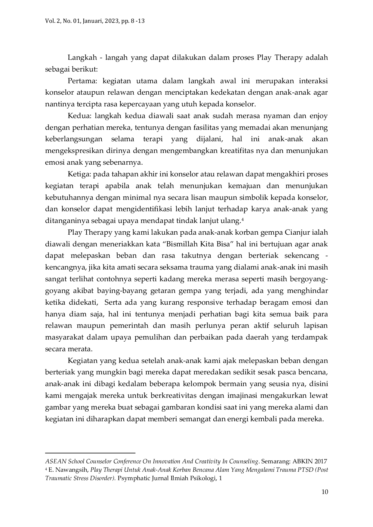 Jurnal Pengabdian West ScienceJurnal Pengabdian West SciencePasca gempa Cianjur yang terjadi pada tanggal 21 November 2021 nampaknya masih menyisakan duka dan trauma yang begitu mendalam bagi warganya. Tujuan dari pengabdian masyarakat ini adalah memberikan dukungan dan bantuan secara psikis, sehingga dapat membantu sedikit memulihkan semangat masyarakat dari rasa trauma pasca gempa terutama anak-anak. Pendekatan yang digunakan dalam proses trauma healing pada anak-anak korban gempa Cianjur yaitu dengan pendekatan Play Therapy, pendekatan ini dalam kegiatan utamanya adalah bermain sehingga diharapkan dengan penggunaan metode play therapy anak-anak yang terdampak dapat berangsur-angsur membaik dan kembali percaya diri tanpa rasa trauma dan takut, sehingga apabila digunakan dalam situasi dan kondisi yang tepat pendekatan ini dapat bermakna sebagai kegiatan fisik sekaligus sebagai terapi.