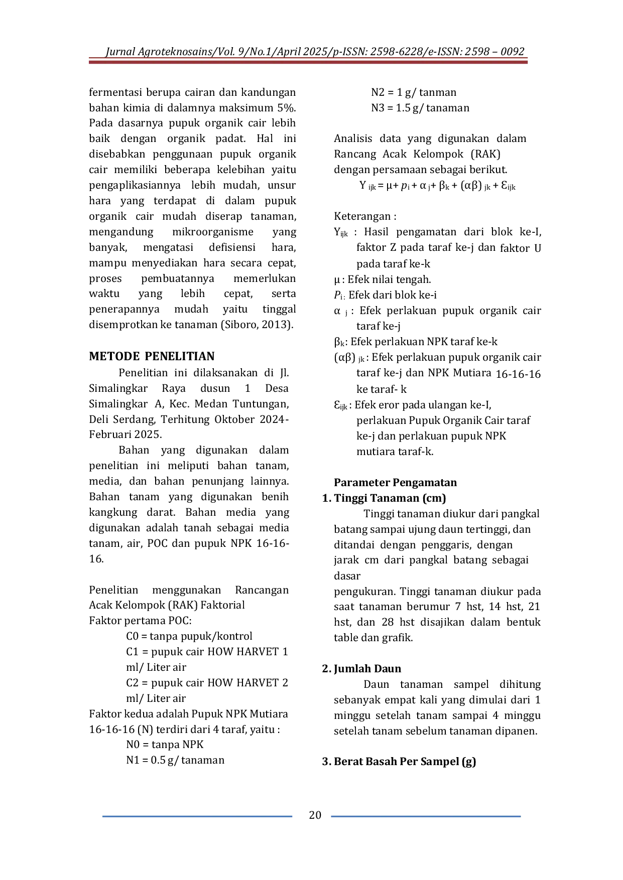 Bad request!Bad request!Penelitian bertujuan untuk mengetahui pengaruh pemberian pupuk NPK dan POC terhadap pertumbuhan dan hasil tanaman kangkung darat. Rancangan Acak Kelompok (RAK) Faktorial digunakan dalam penelitian ini yang terdiri atas dua faktor, pertama: POC terdiri atas 3 C0 = tanpa pupuk/control, C1 = POC 1 ml/ liter air, dan C2 = POC 2 ml/ liter air; kedua NPK Mutiara 16-16-16 (N) terdiri atas N0 = tanpa NPK, N1 = 0.5 g/ tanaman, N2 = 1 g/ tanman, dan N3 = 1.5 g/ tanaman. Hasil penelitian menunjukkan N2 49, 1 cm dan N3 52 cm merupakan perlakuan optimum yang memberikan pertumbuhan tinggi tanaman tertinggi dibandingkan dengan perlakuan lainnya. Jumlah daun terbanyak pada 28 HST adalah N3 30,3 helai berbeda nyata dengan N2 27,5 helai, N1 25,5 helai, dan N0 23,1 helai.Pengaruh POC jumlah daun terbanyak pada 28 HST C2 31,7 helai berbeda nyata dengan C1 25,5 helai dan C0 22,6 helai. Produksi kangkung per sampel N3 104,3 g merupakan perlakuan optimum dan C2 menghasilkan bobot kangkung tertinggi 101,7 g. Produksi per plot tertinggi ditemukan pada N2 794,4 g dan terendah N0 339,5 g.